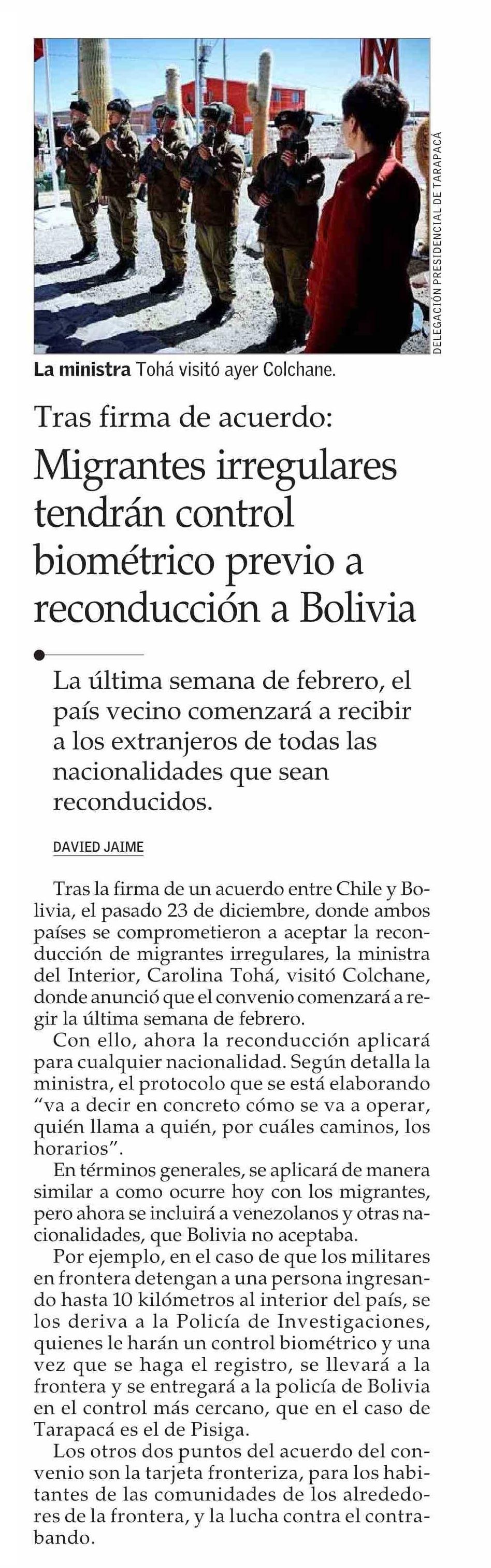 Migrantes irregulares tendrán control biométrico previo a reconducción a Bolivia 15-01-2025 El Mercurio |