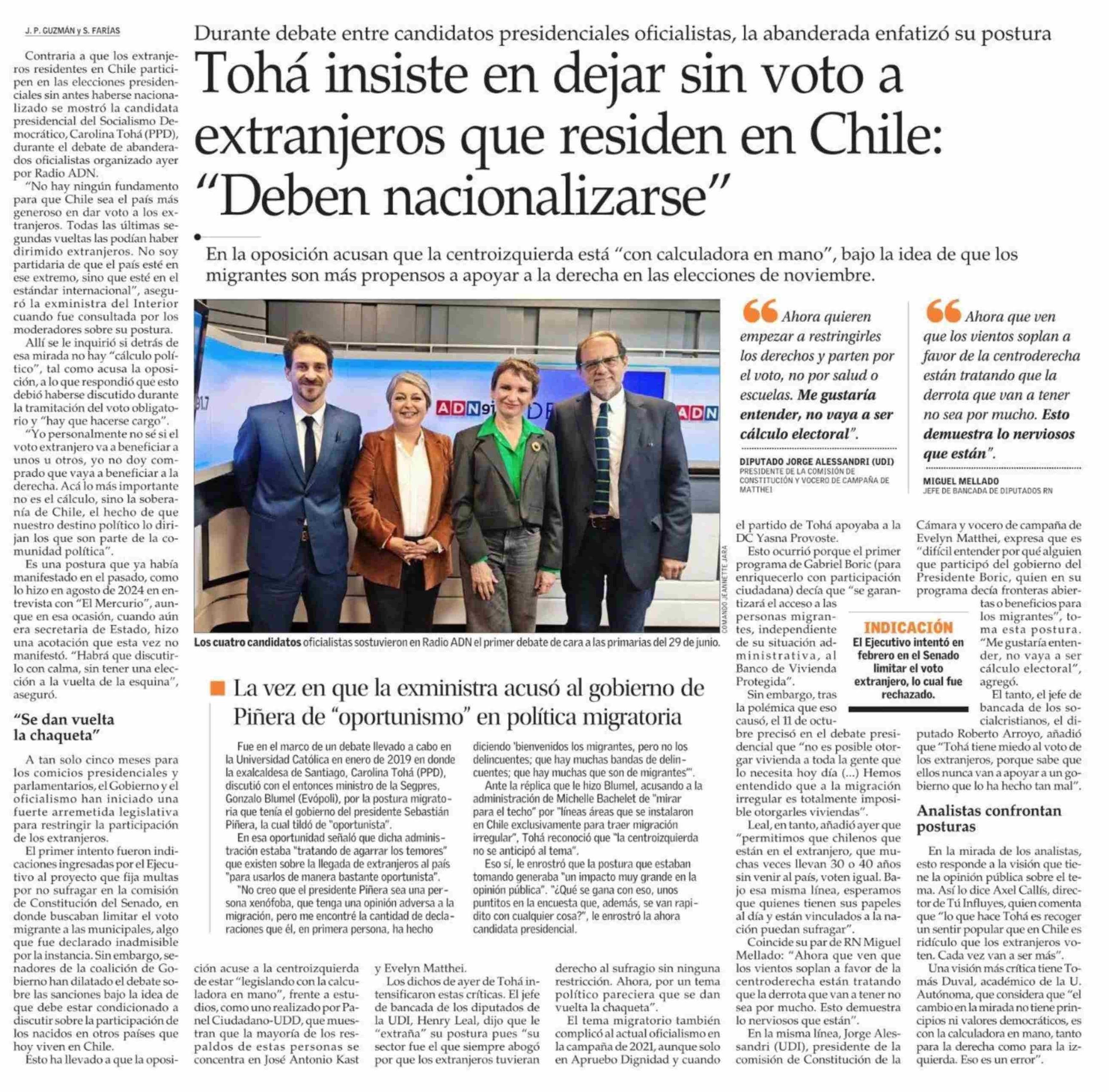 Tohá insiste en dejar sin voto a extranjeros que residen en Chile: “Deben nacionalizarse” 27-05-2025 El Mercurio |