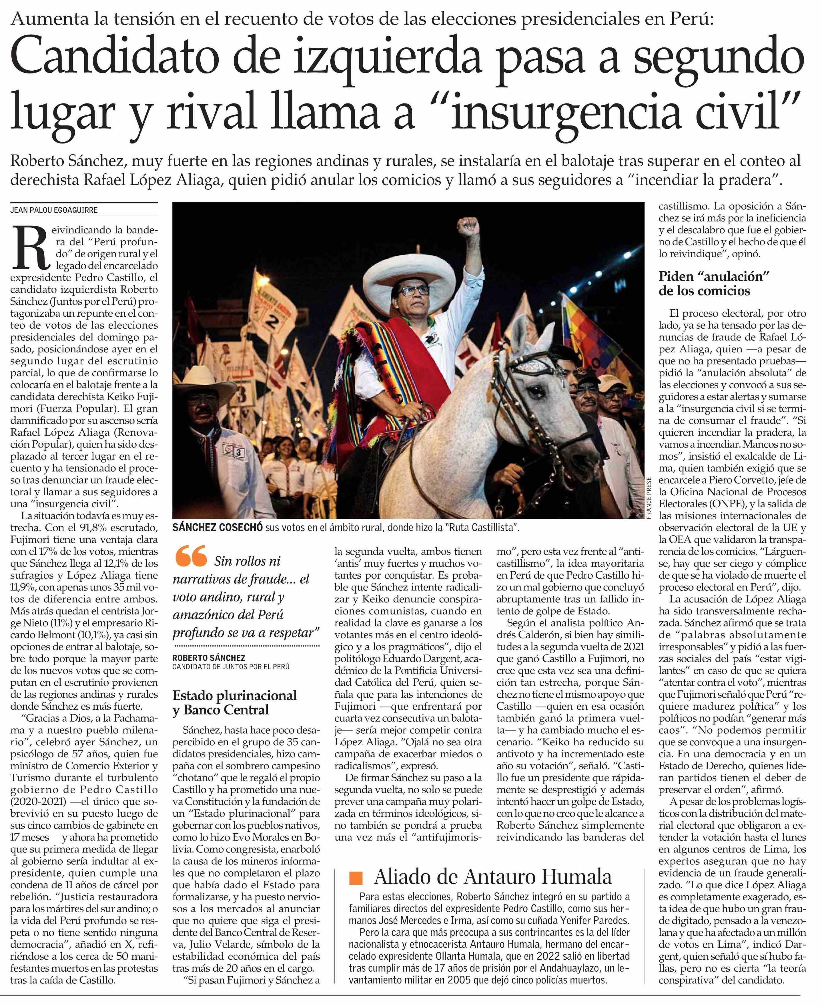 | Título: | Candidato de izquierda pasa a segundo lugar y rival llama a “insurgencia civil” |