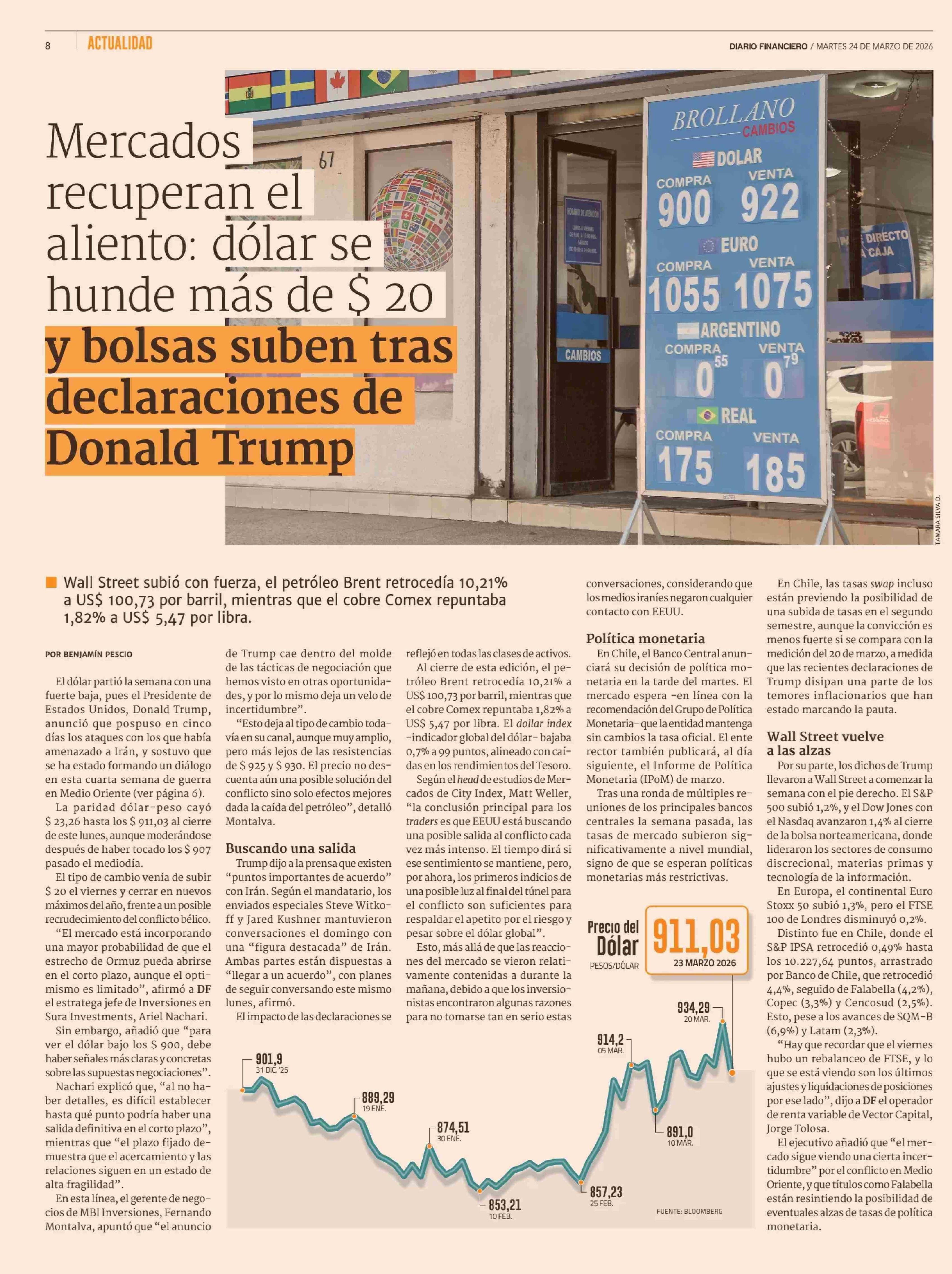 Mercados recuperan el aliento,dólar se hunde más de $20 y bolsa suben tras declaraciones de Donald Trump 24-03-2026 Diario Financiero |