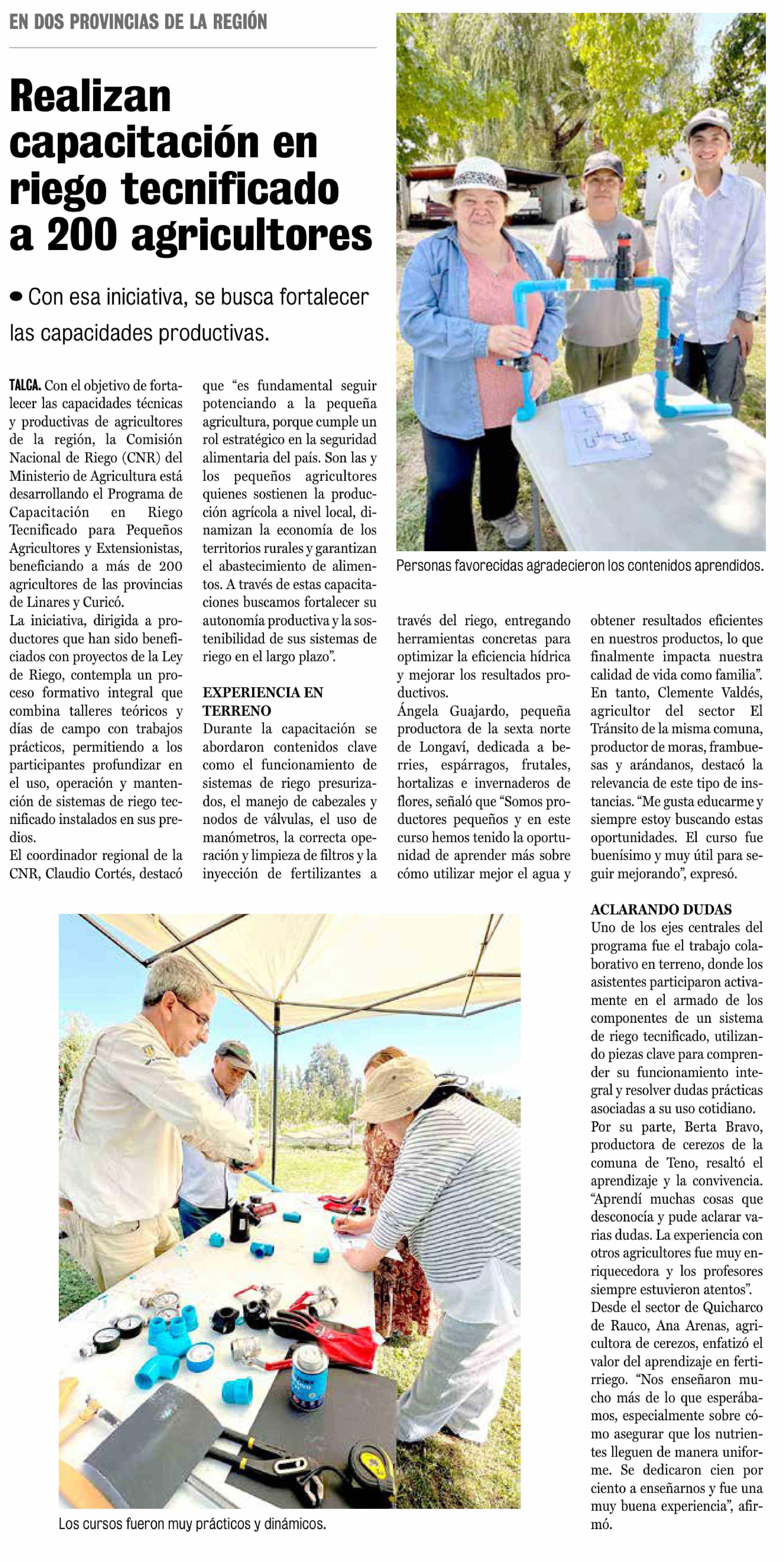 Realizan capacitación en riego tecnificado a 200 agricultores 01-02-2026 La Prensa de Curicó |