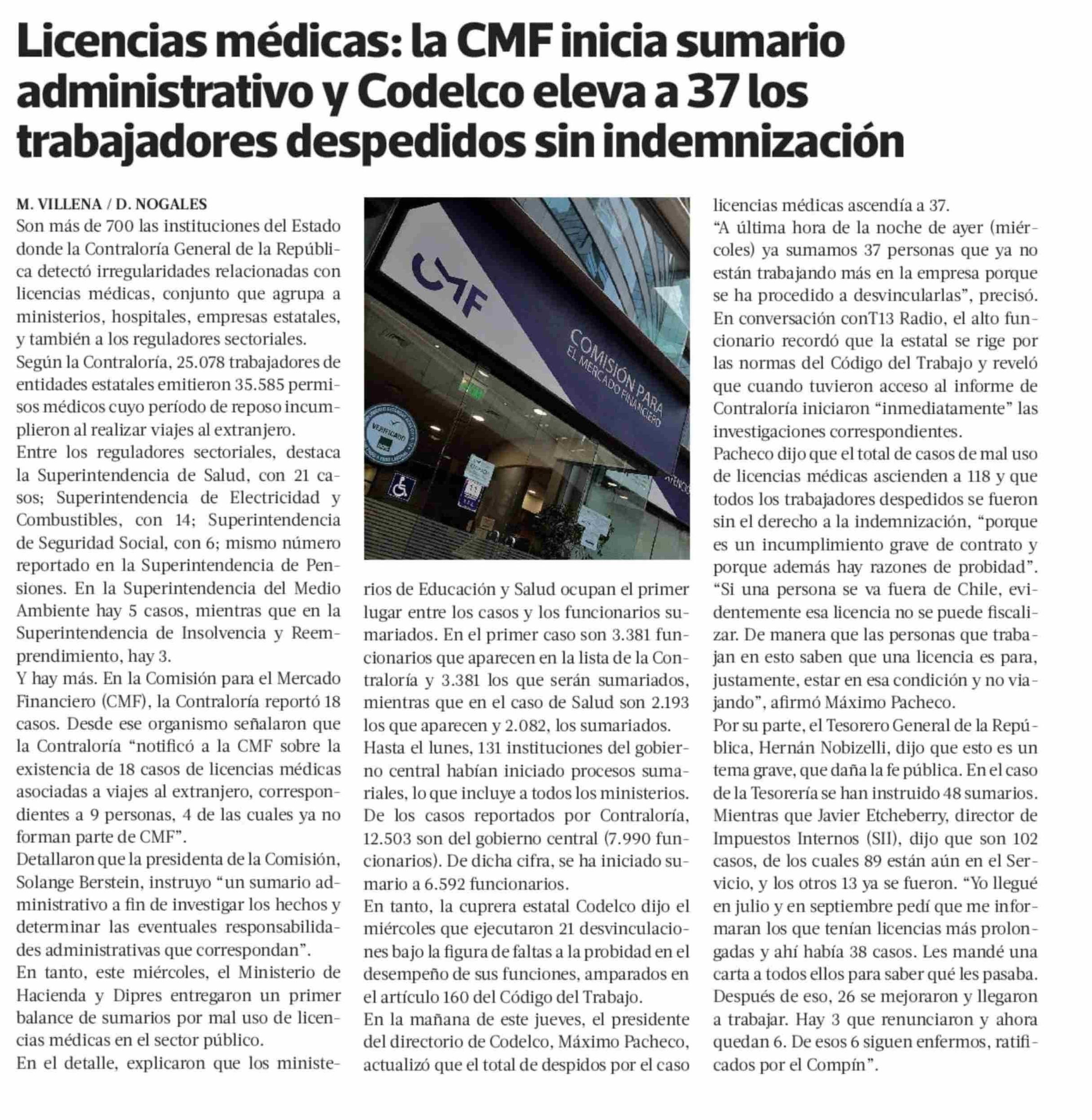 Título: Licencias médicas: la CMF inicia Sumario administrativo y Codelco eleva a 37 los trabajadores despedidos sin indemnización
