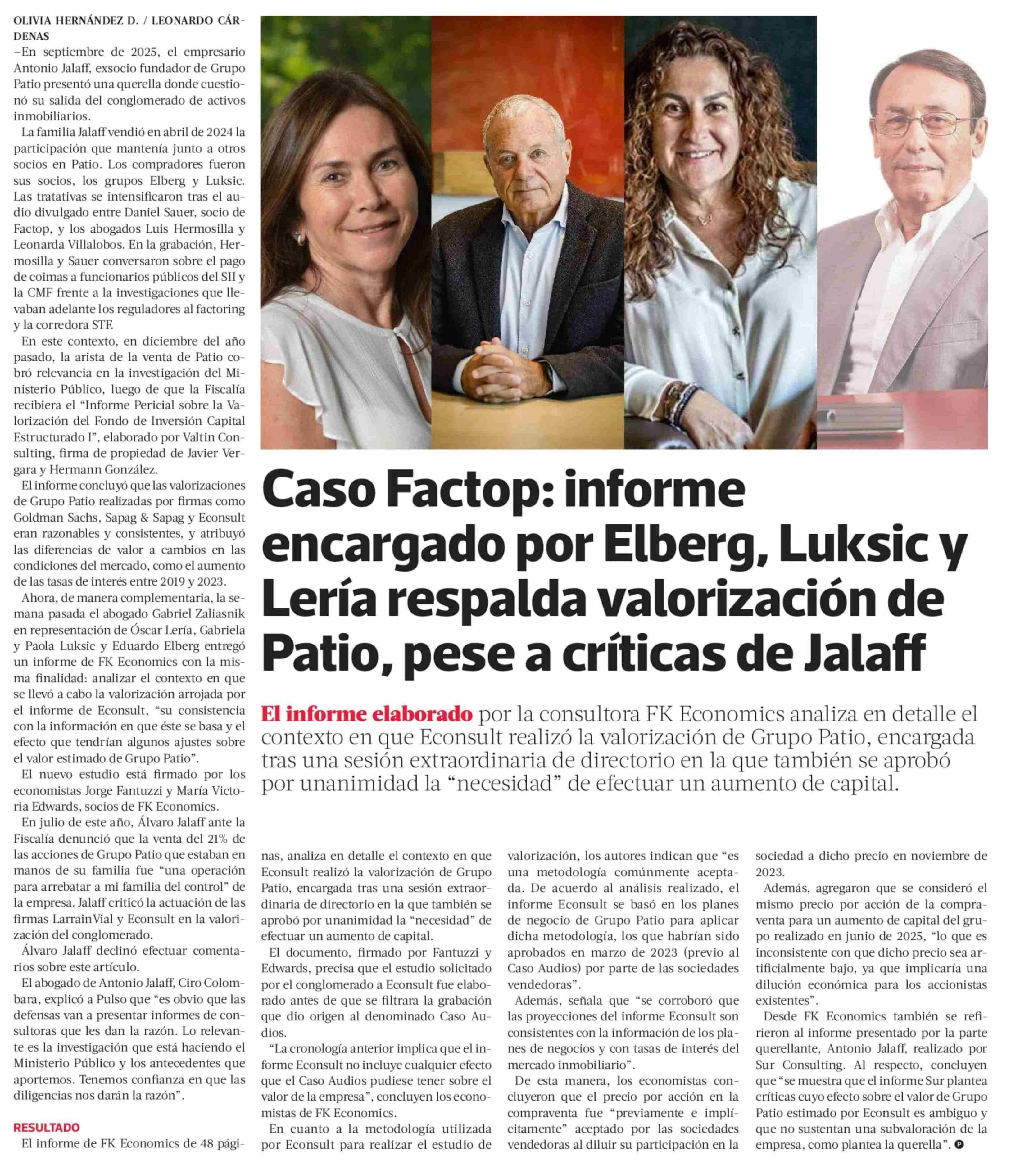Título: Caso Factop: informe encargado por Elberg, Luksic y Lería respalda valorización de Patio, pese a críticas de Jalaff