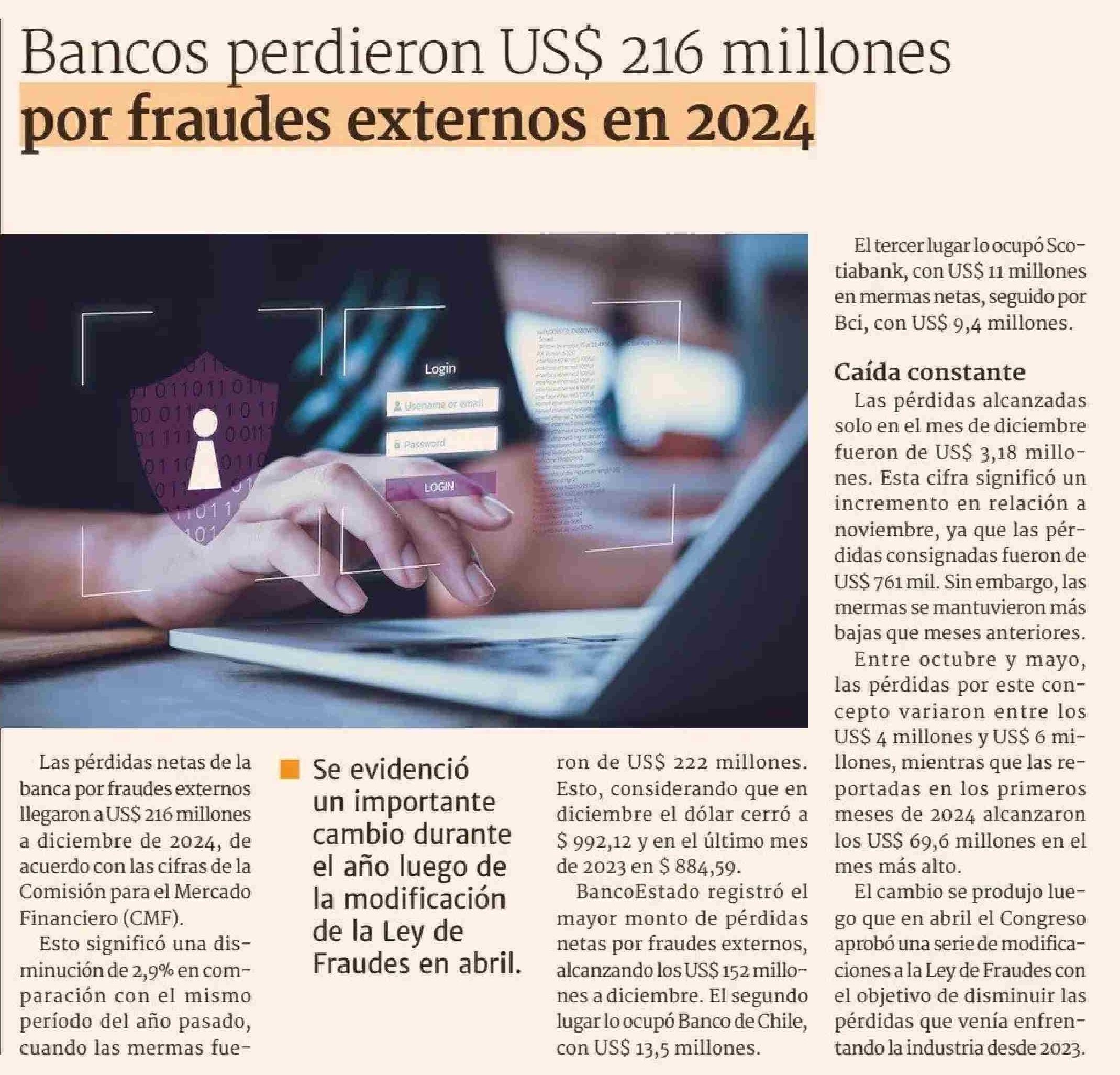 Bancos perdieron US$ 216 millones por fraudes externos en 2024 03-02-2025 Diario Financiero |