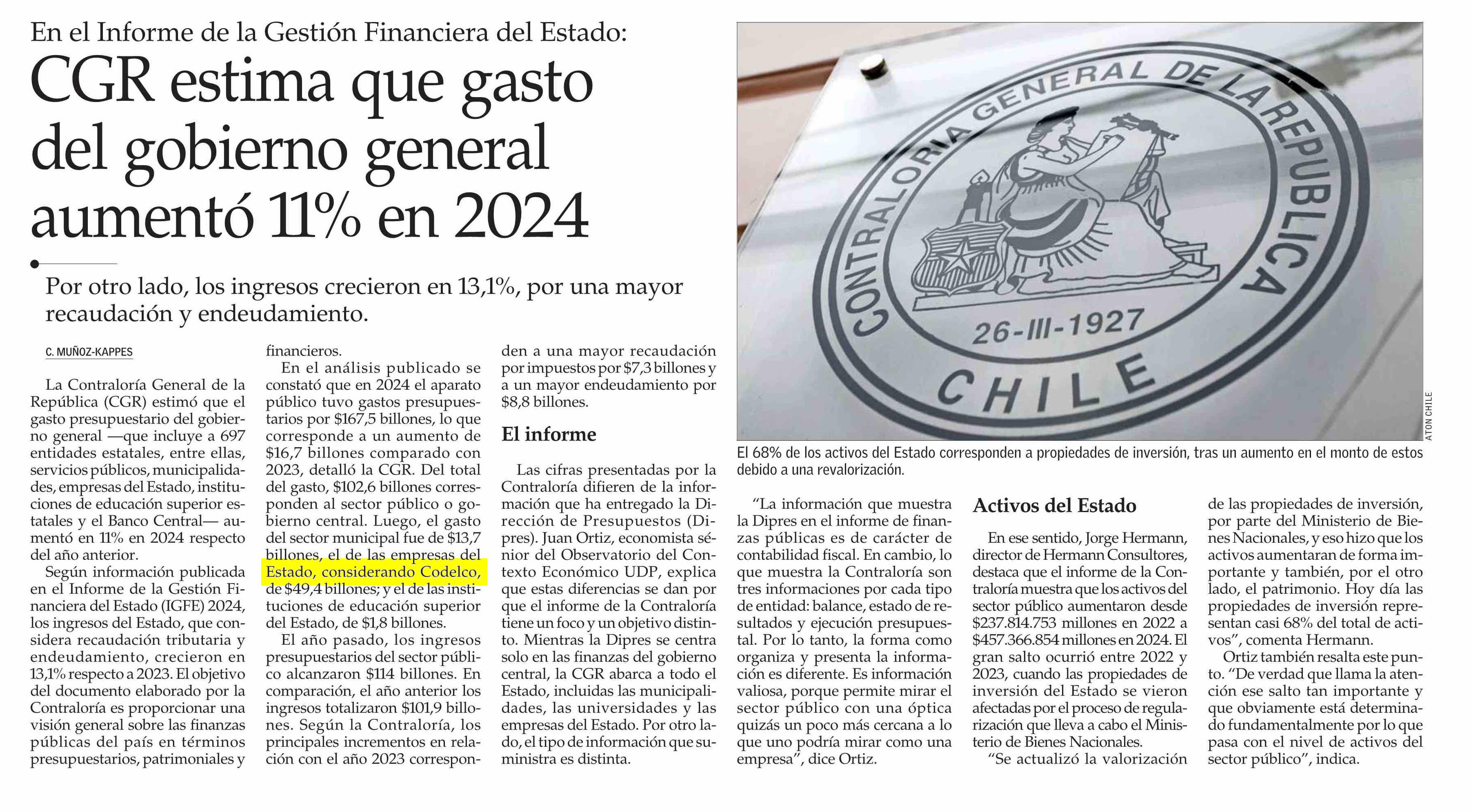 CGR estima que gasto del gobierno general aumentó 11% en 2024 23-05-2025 El Mercurio |