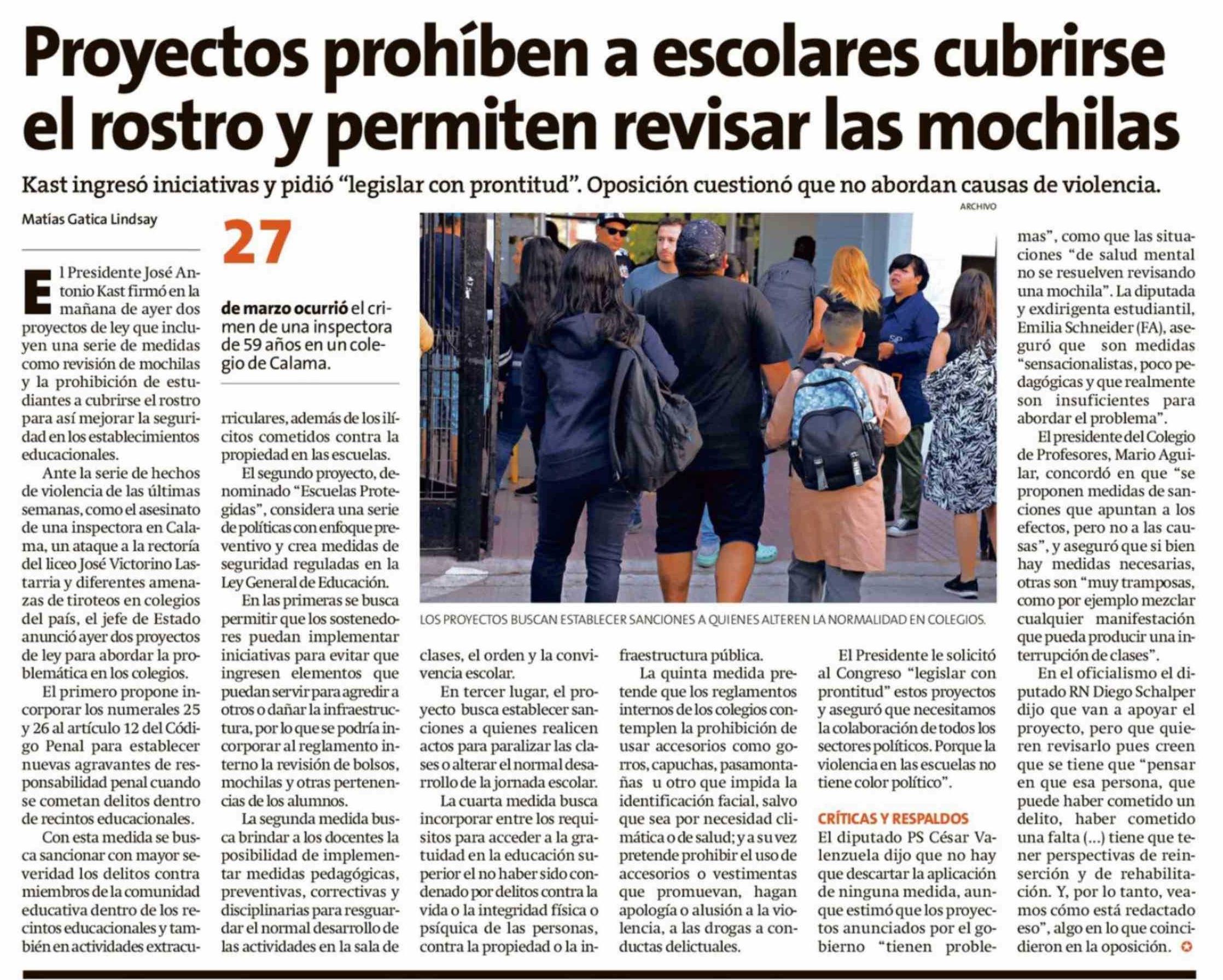 Título: Proyectos prohíben a escolares cubrirse el rostro y permiten revisar las mochilas