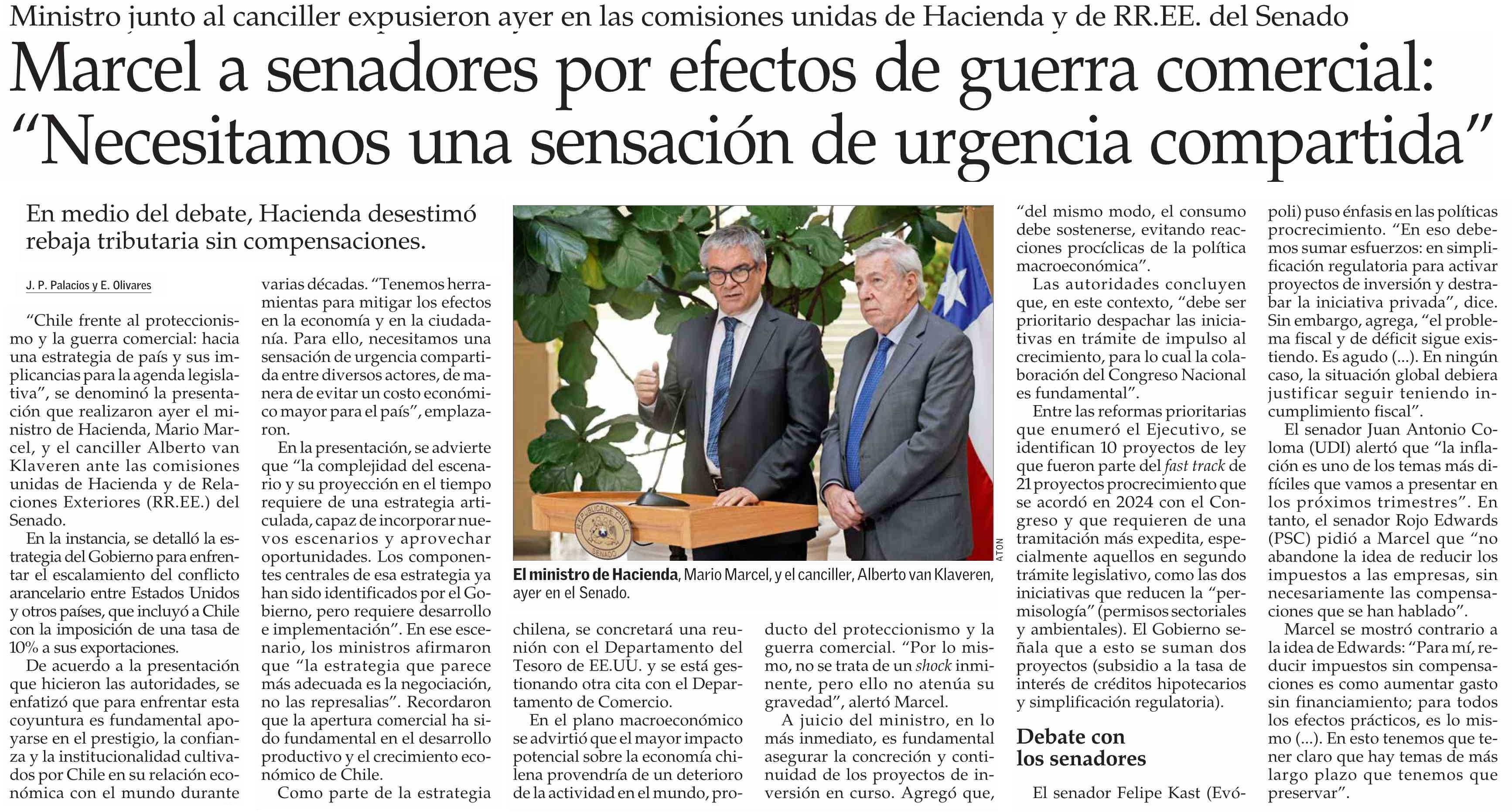 | Título: | Marcel a senadores por efectos de guerra comercial: “Necesitamos una sensación de urgencia compartida” |