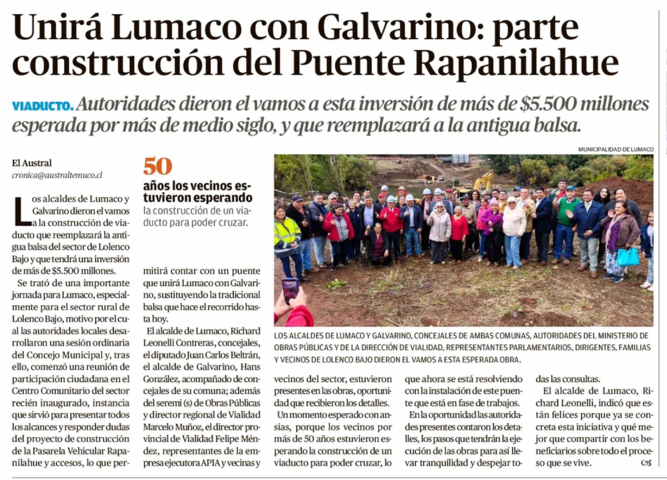 Título: Unirá Lumaco con Galvarino: parte construcción del Puente Rapanilahue