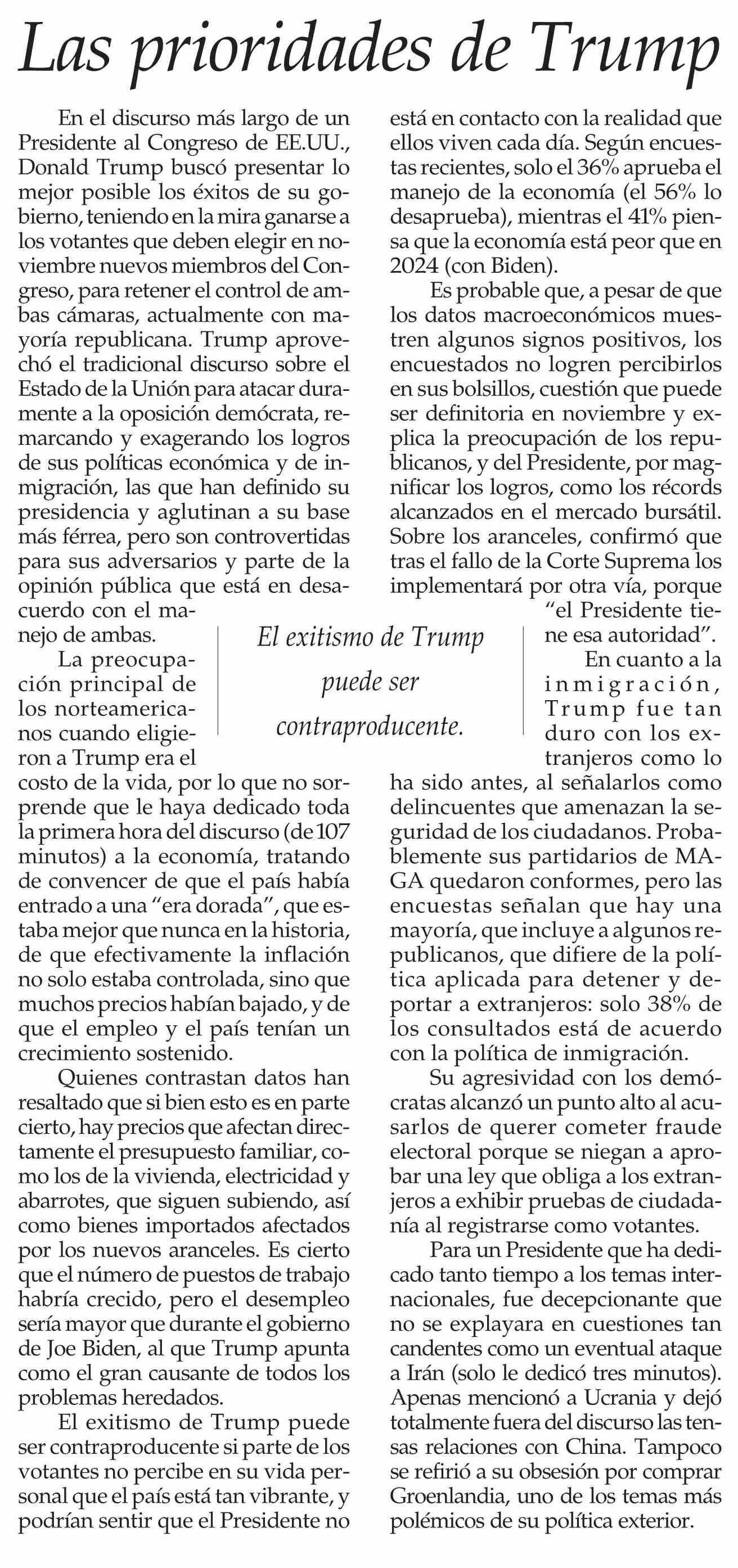 Editorial: Las prioridades de Trump 26-02-2026 El Mercurio |