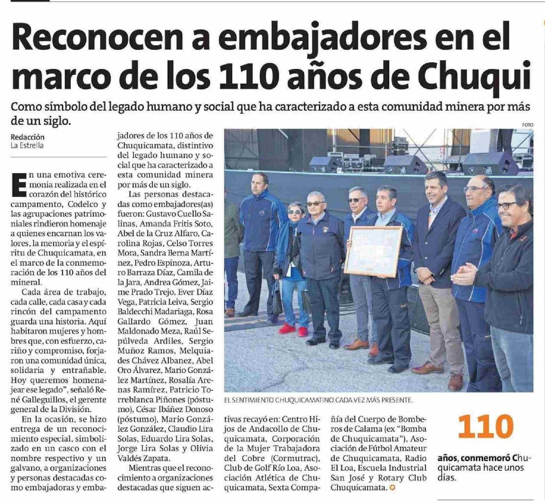 Reconocen a embajadores en el marco de los 110 años de Chuqui 28-05-2025 La Estrella de Antofagasta |
