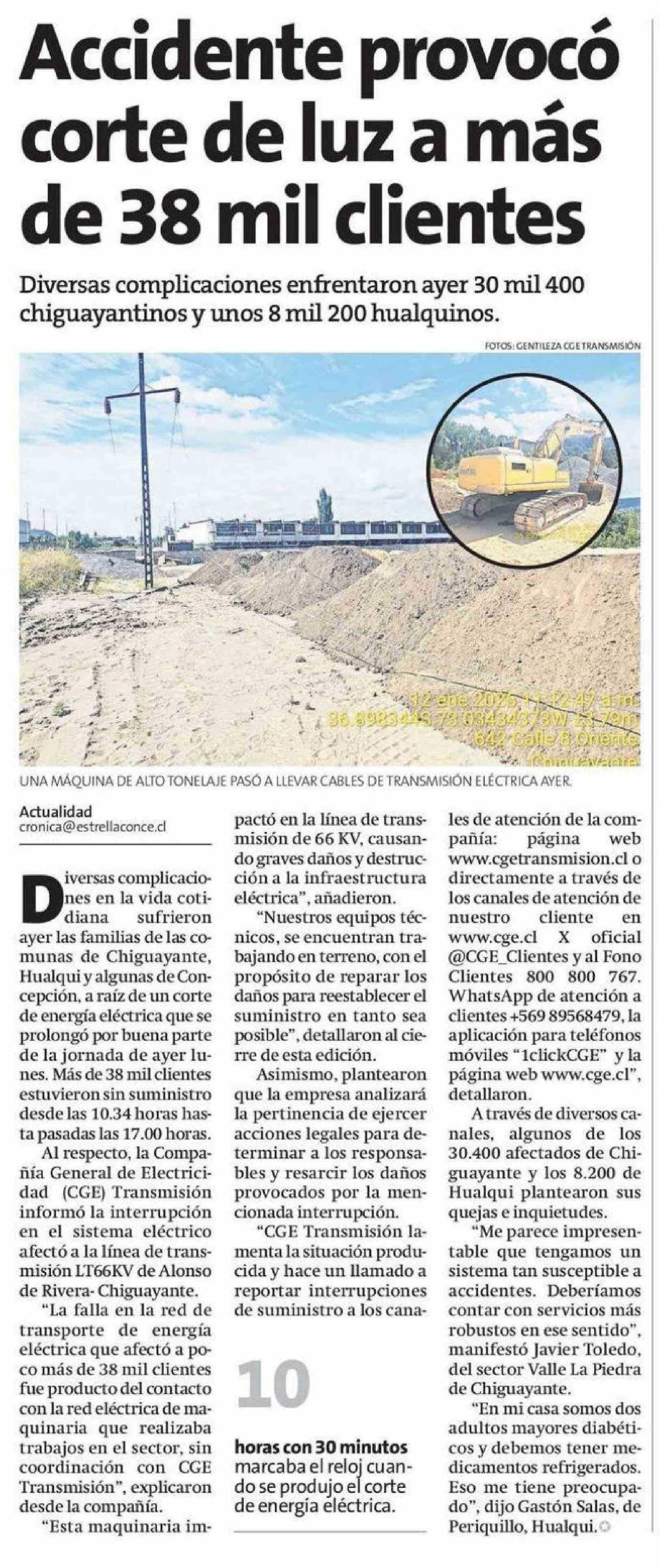 Accidente provocó corte de luz a más de 38 mil clientes 13-01-2026 La Estrella de Concepción |