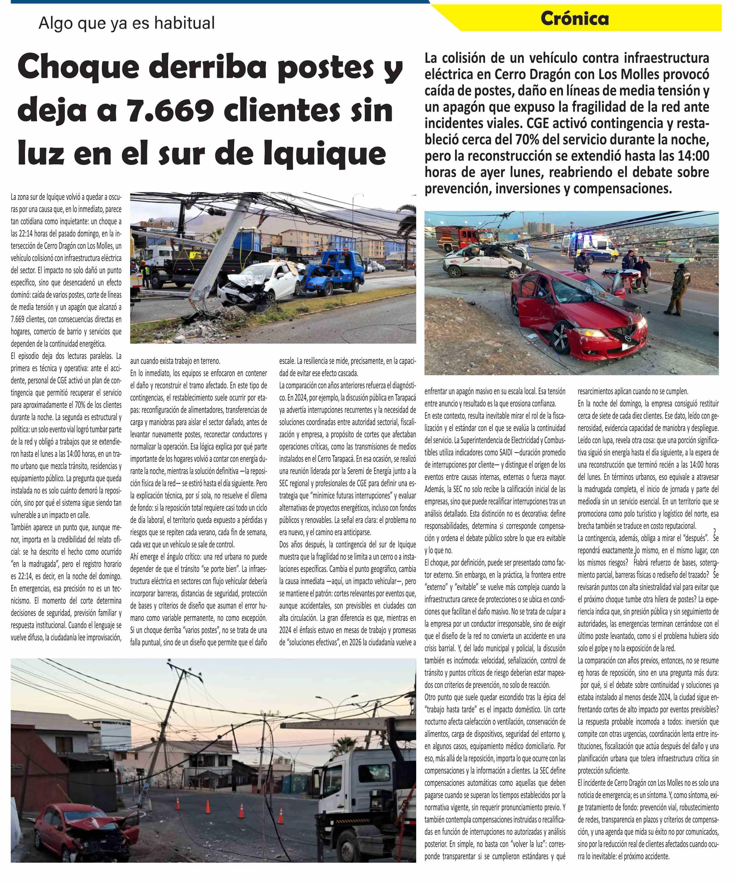 Choque derriba postes y deja a 7.669 clientes sin luz en el sur de Iquique 13-01-2026 El Longino |