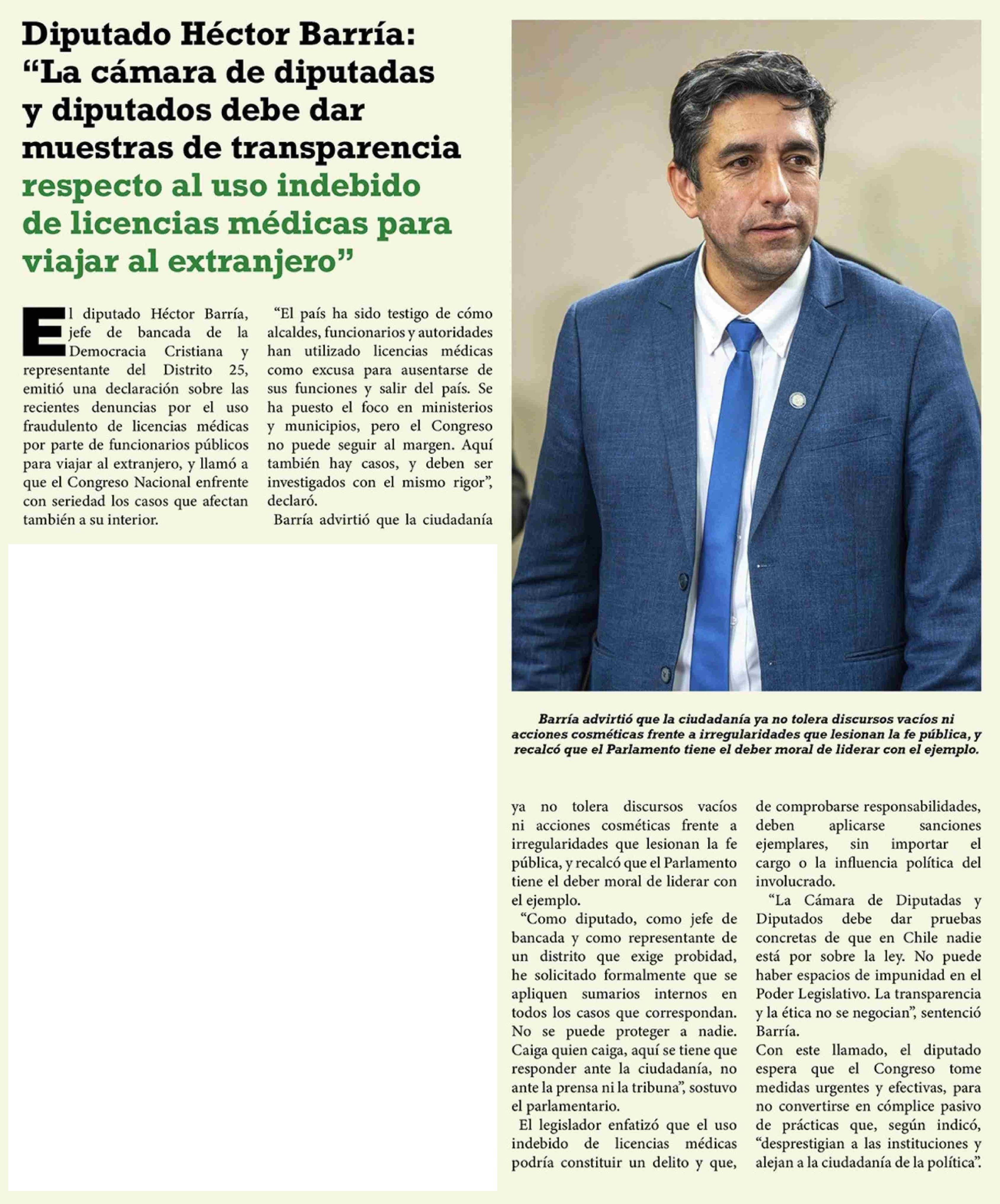 Título: Diputado Héctor Barría: “La cámara de diputadas y diputados debe dar muestras de transparencia respecto al uso indebido de licencias médicas para viajar al extranjero”