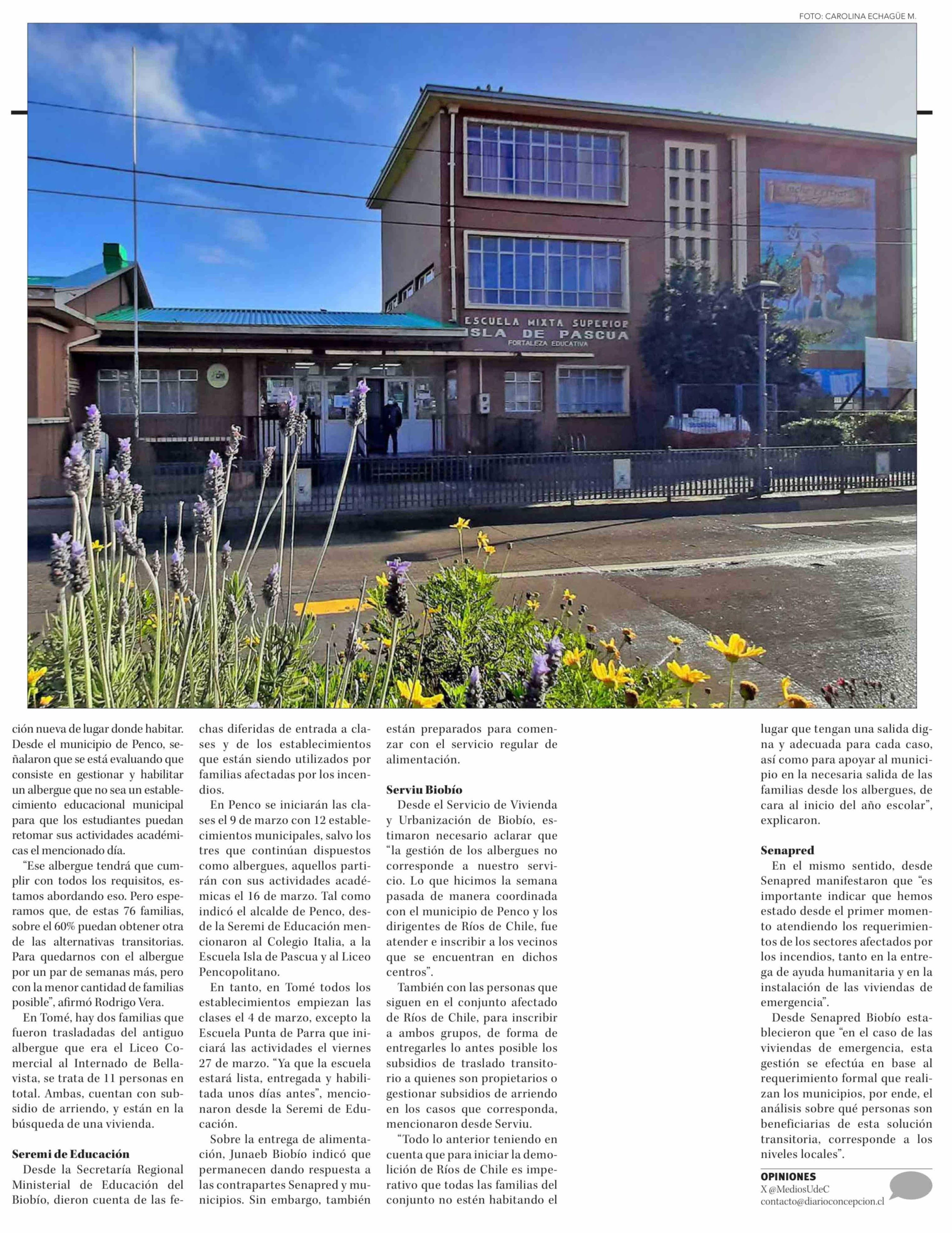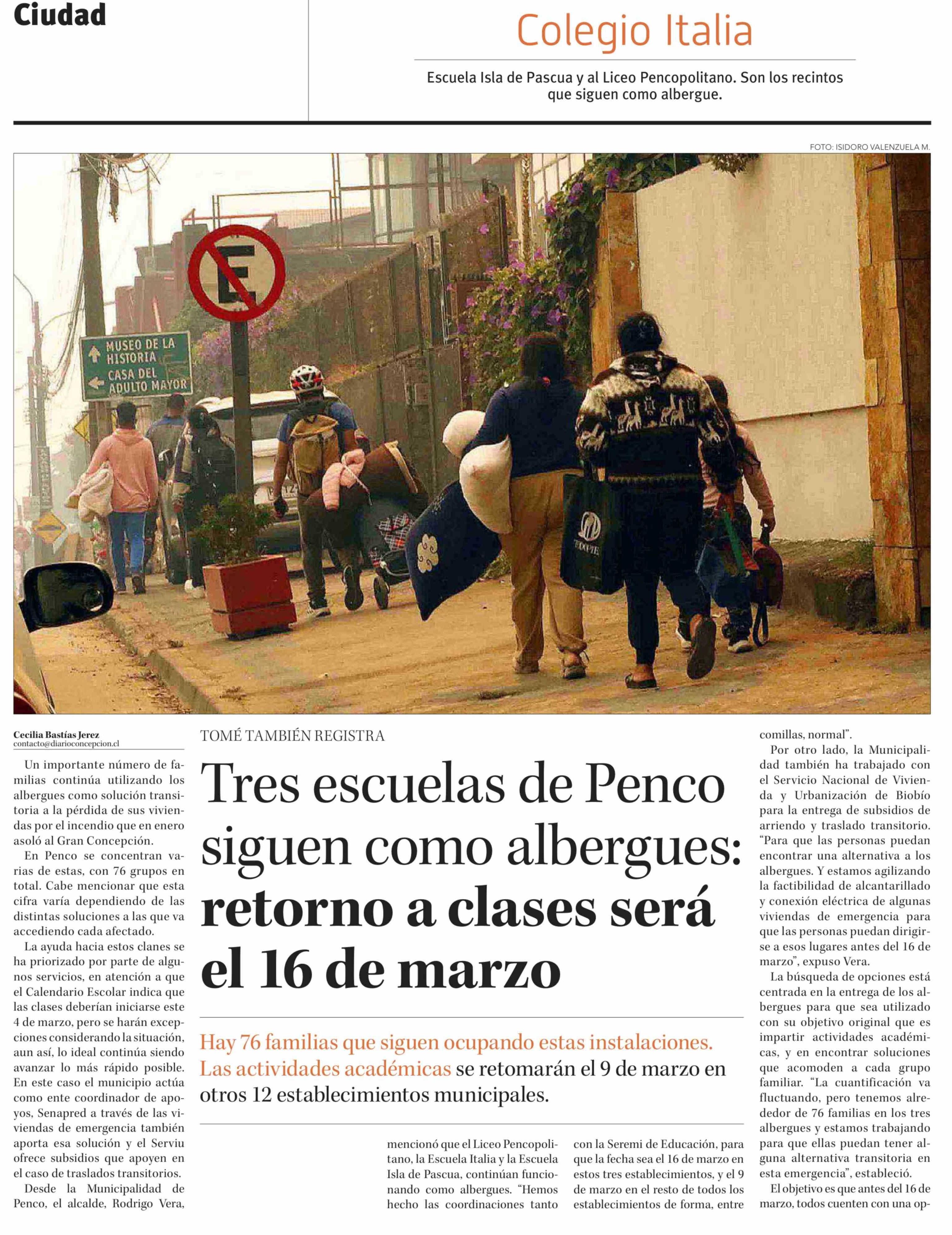 Tres escuelas de Penco siguen como albergues: retorno a clases será el 16 de marzo 03-03-2026 Diario Concepción |