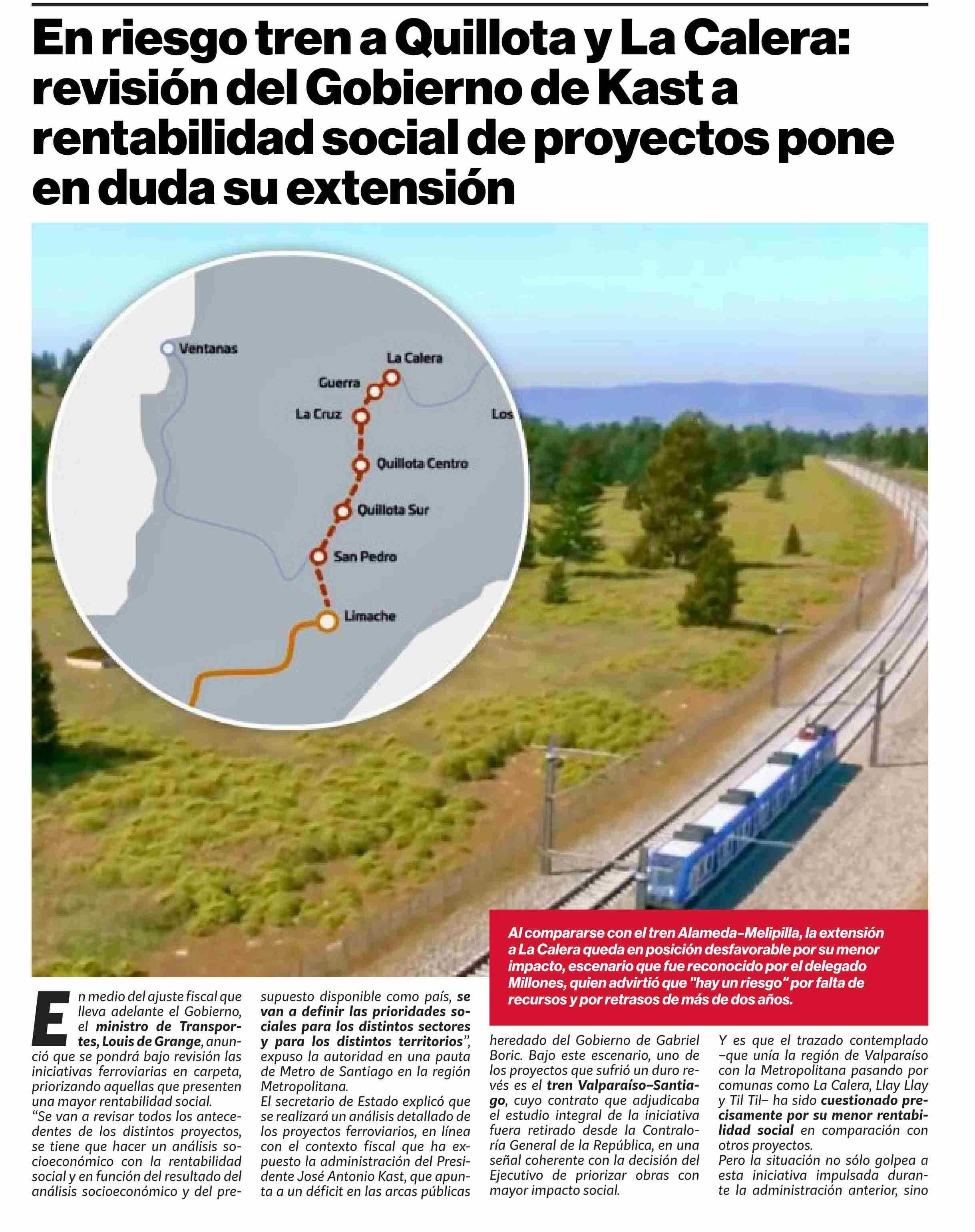 | Título: | En riesgo tren a Quillota y La Calera: revisión del Gobierno de Kast a rentabilidad social de proyectos pone en duda su extensión |
