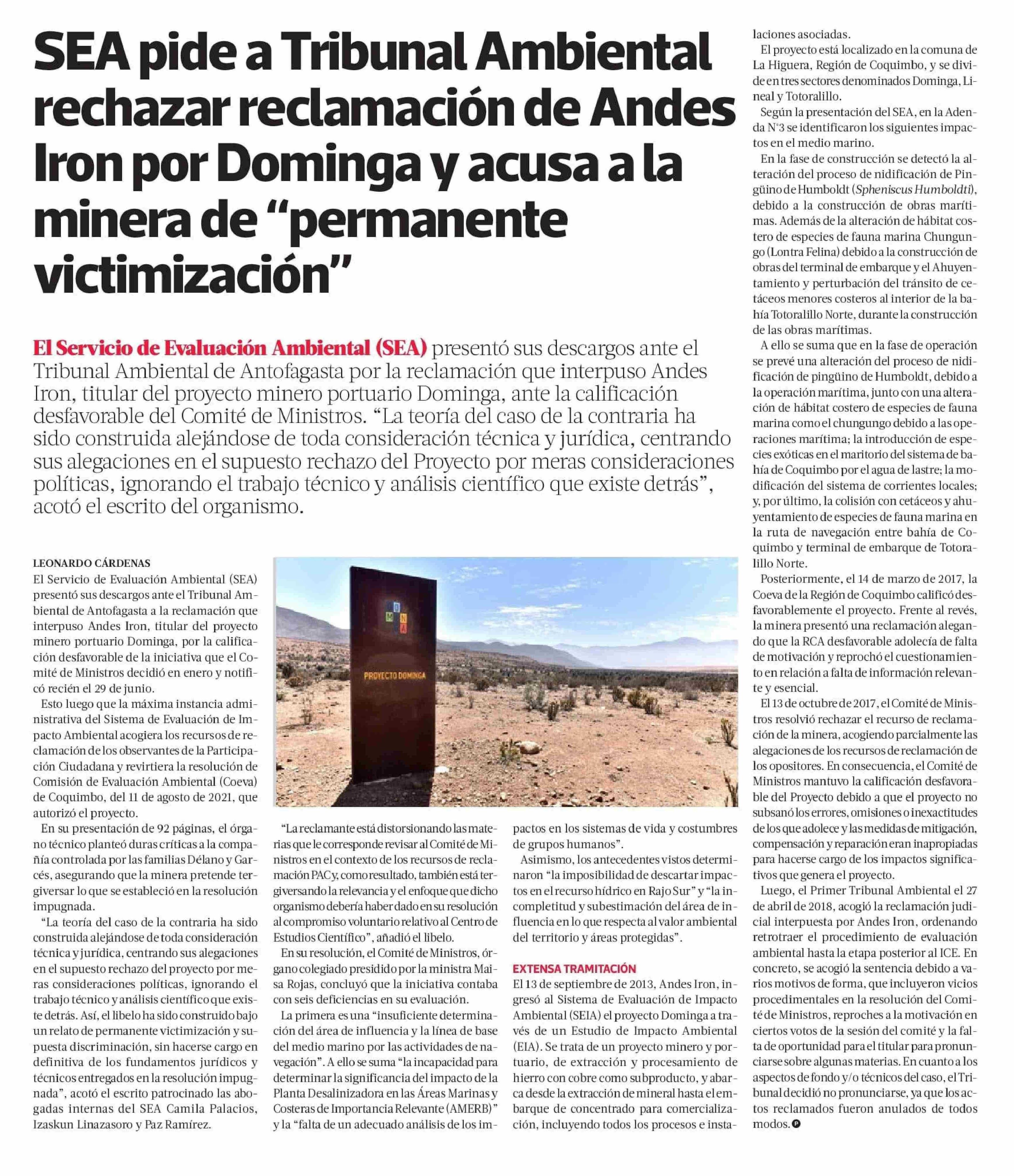 SEA pide a Tribunal Ambiental rechazar reclamación de Andes Iron por Dominga y acusa a la minera de “permanente victimización” 21-09-2023 La Tercera |