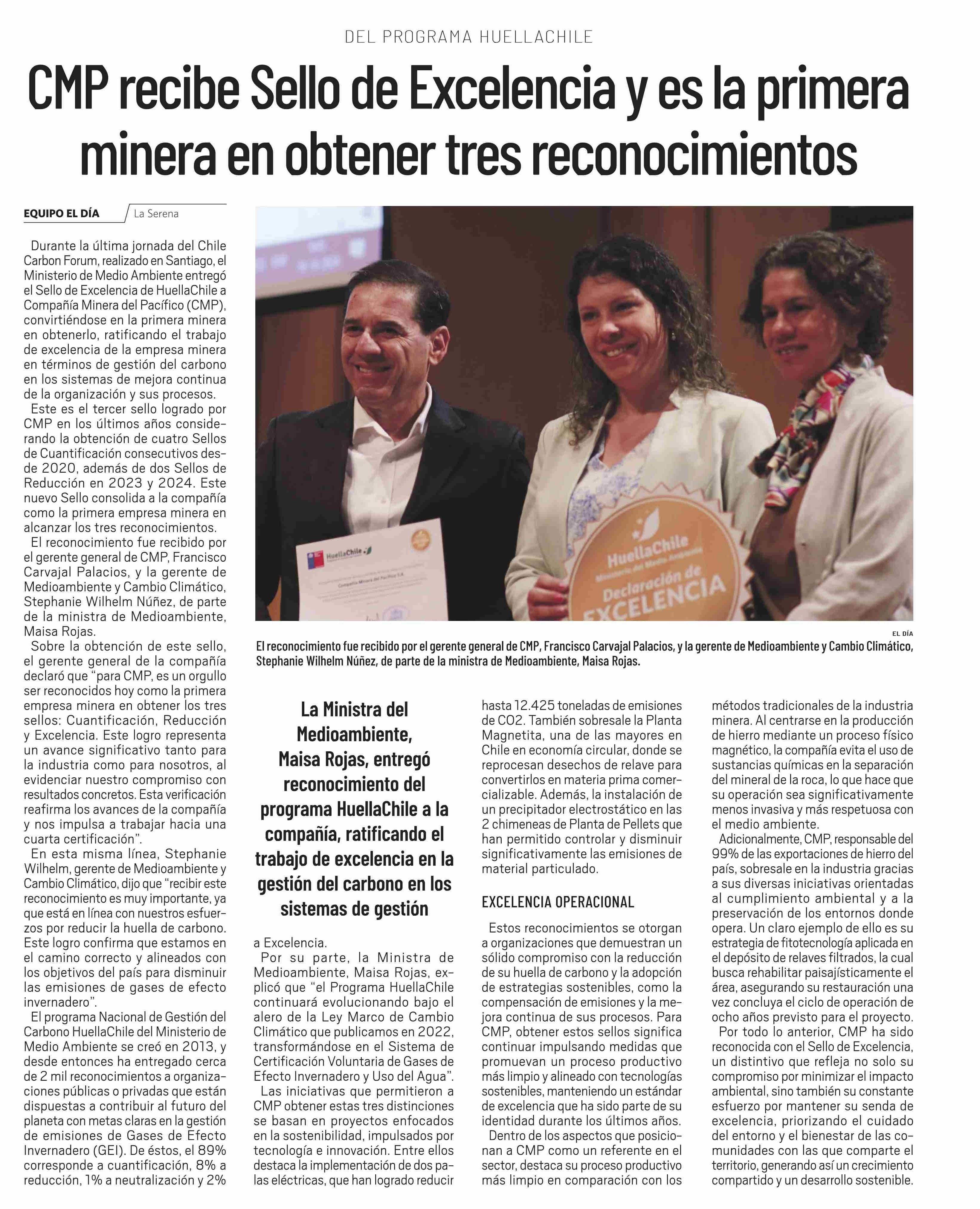 CMP recibe Sello de Excelencia y es la primera minera en obtener tres reconocimientos 13-10-2024 El Día |