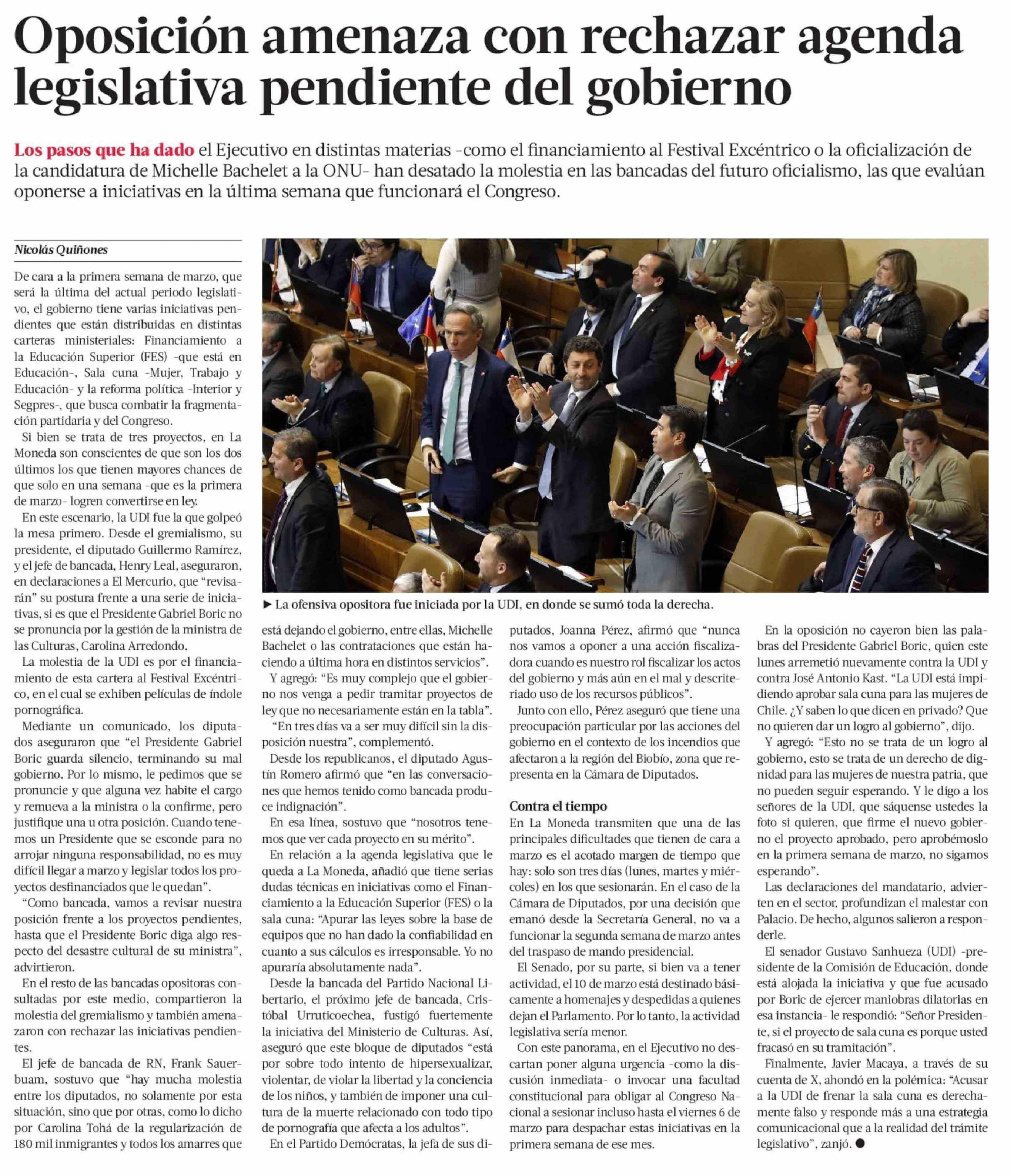 Oposición amenaza con rechazar agenda legislativa pendiente del gobierno 10-02-2026 La Tercera |
