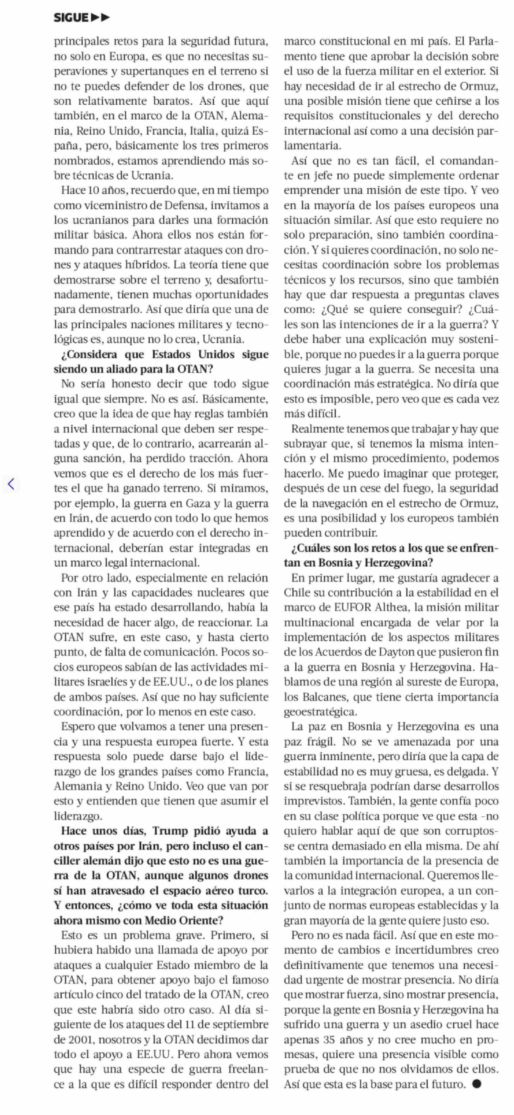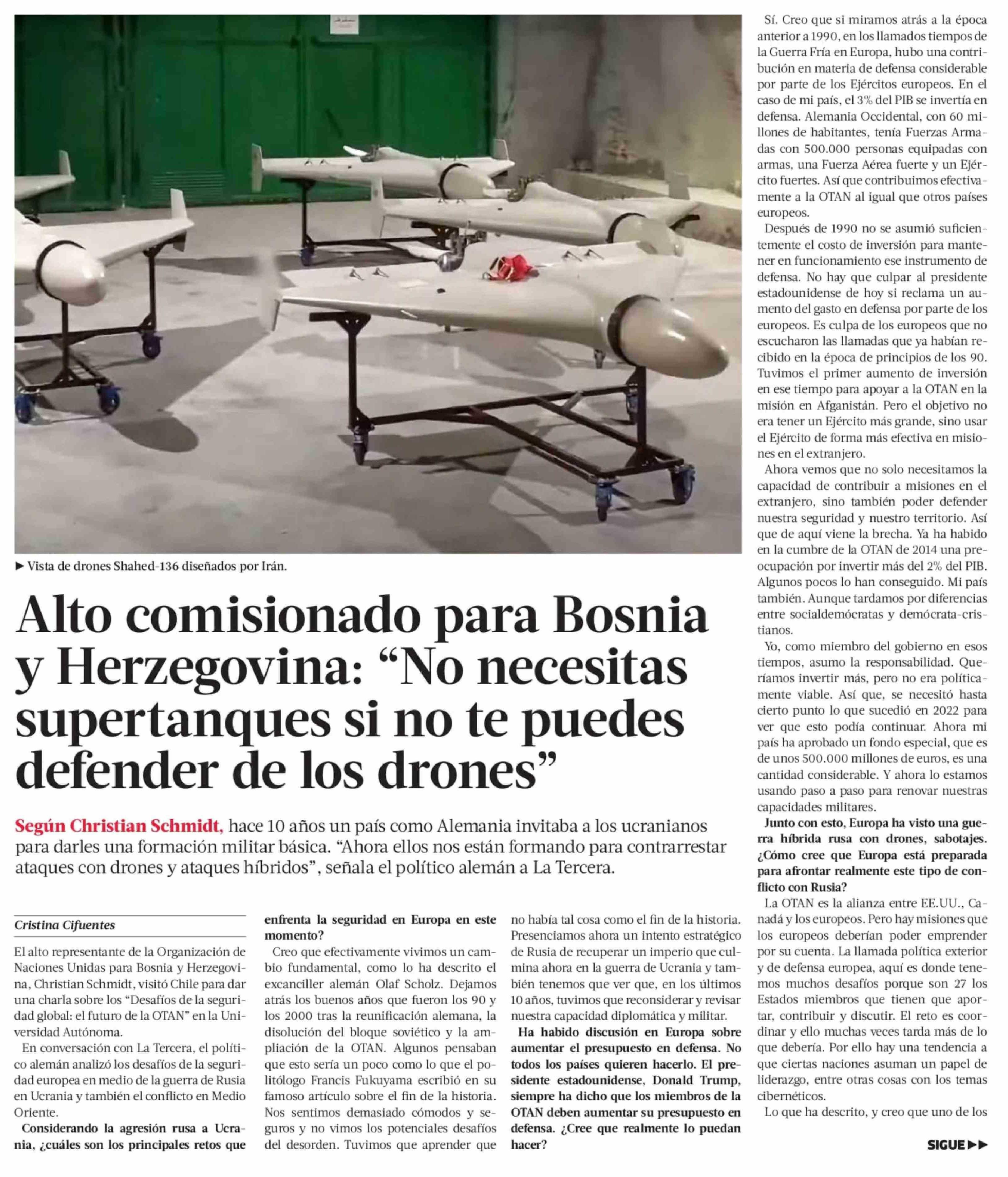 Alto comisionado para Bosnia y Herzegovina: "No necesitas supertanques si no te puedes defender de los drones" 31-03-2026 La Tercera |