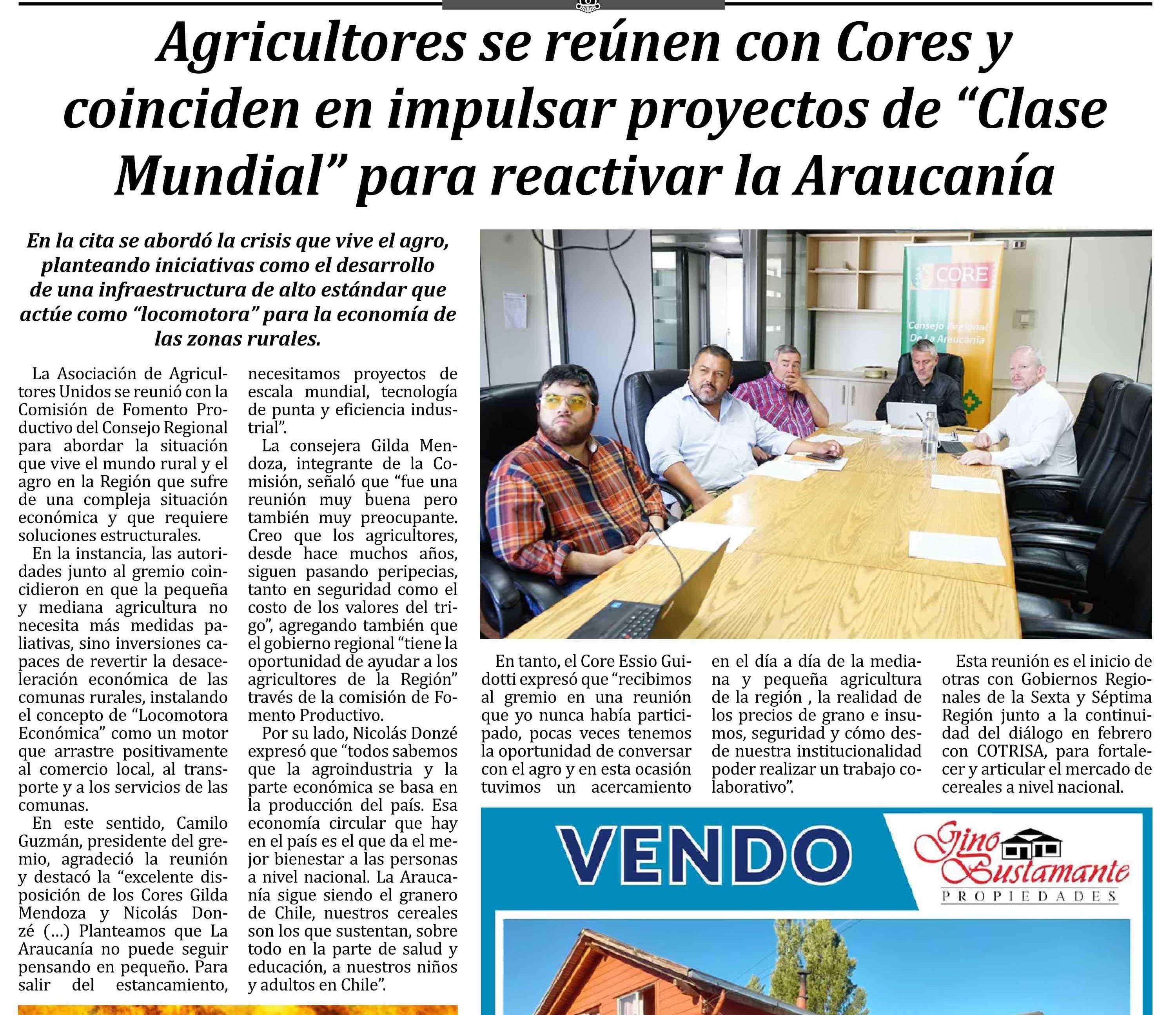 | Título: | Agricultores se reúnen con Cores y coinciden en impulsar proyectos de "Clase Mundial" para reactivar la Araucanía |