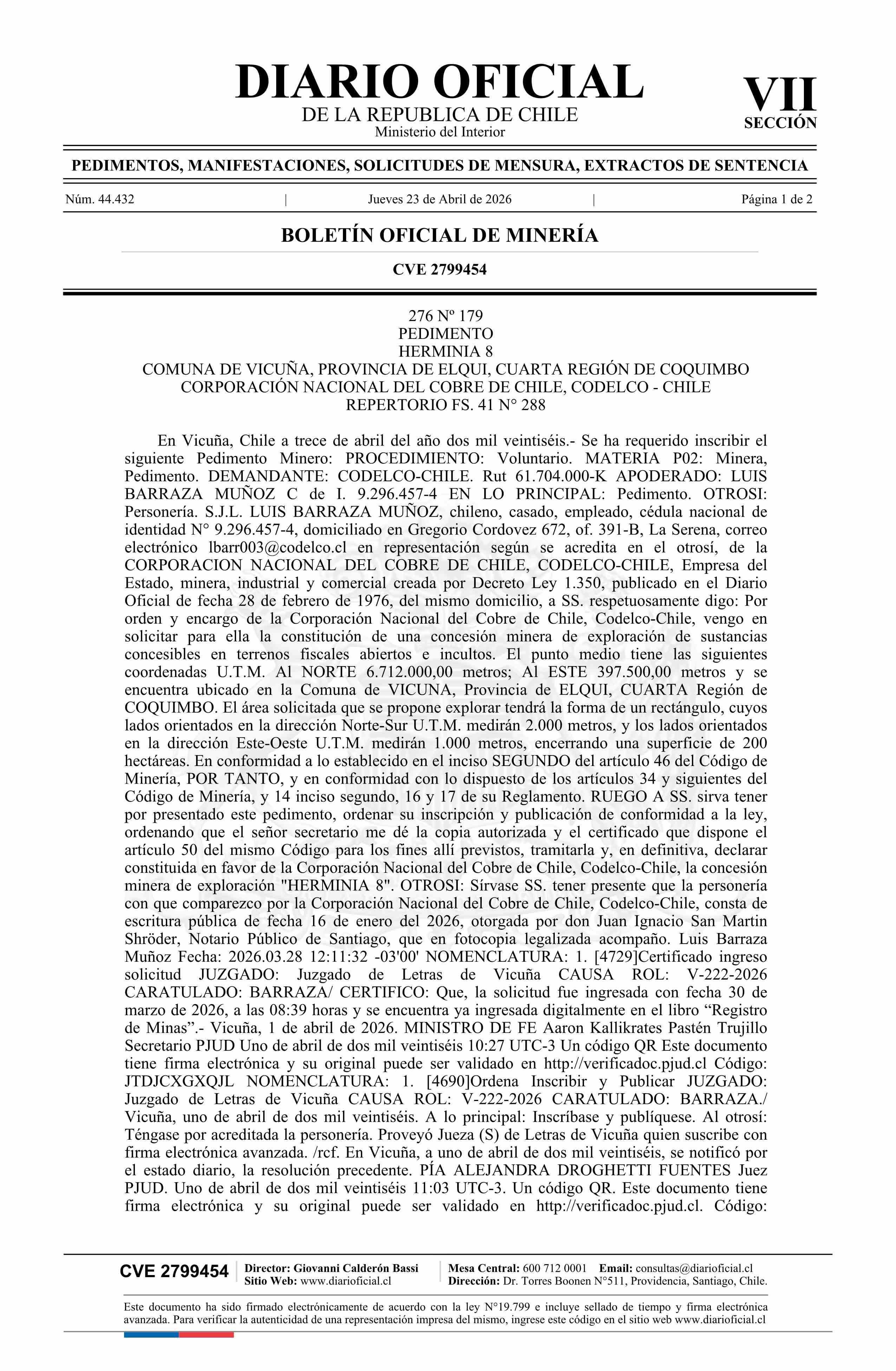 HERMINIA 8 / Corporación Nacional del Cobre de Chile 23-04-2026 DIARIO OFICIAL CHILE - BOLETÍN OFICIAL DE MINERÍA |