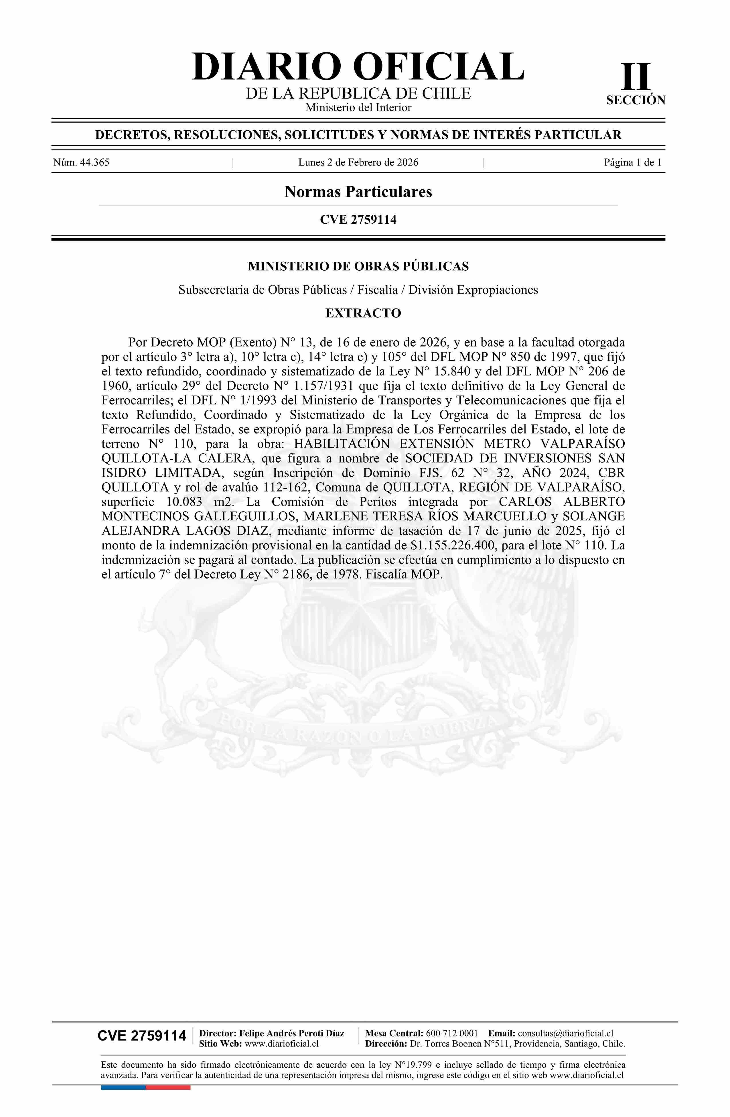 Extracto de decreto exento número 13, de 2026.- Sociedad de Inversiones San Isidro Limitada 02-02-2026 Diario Oficial Edición Electrónica |