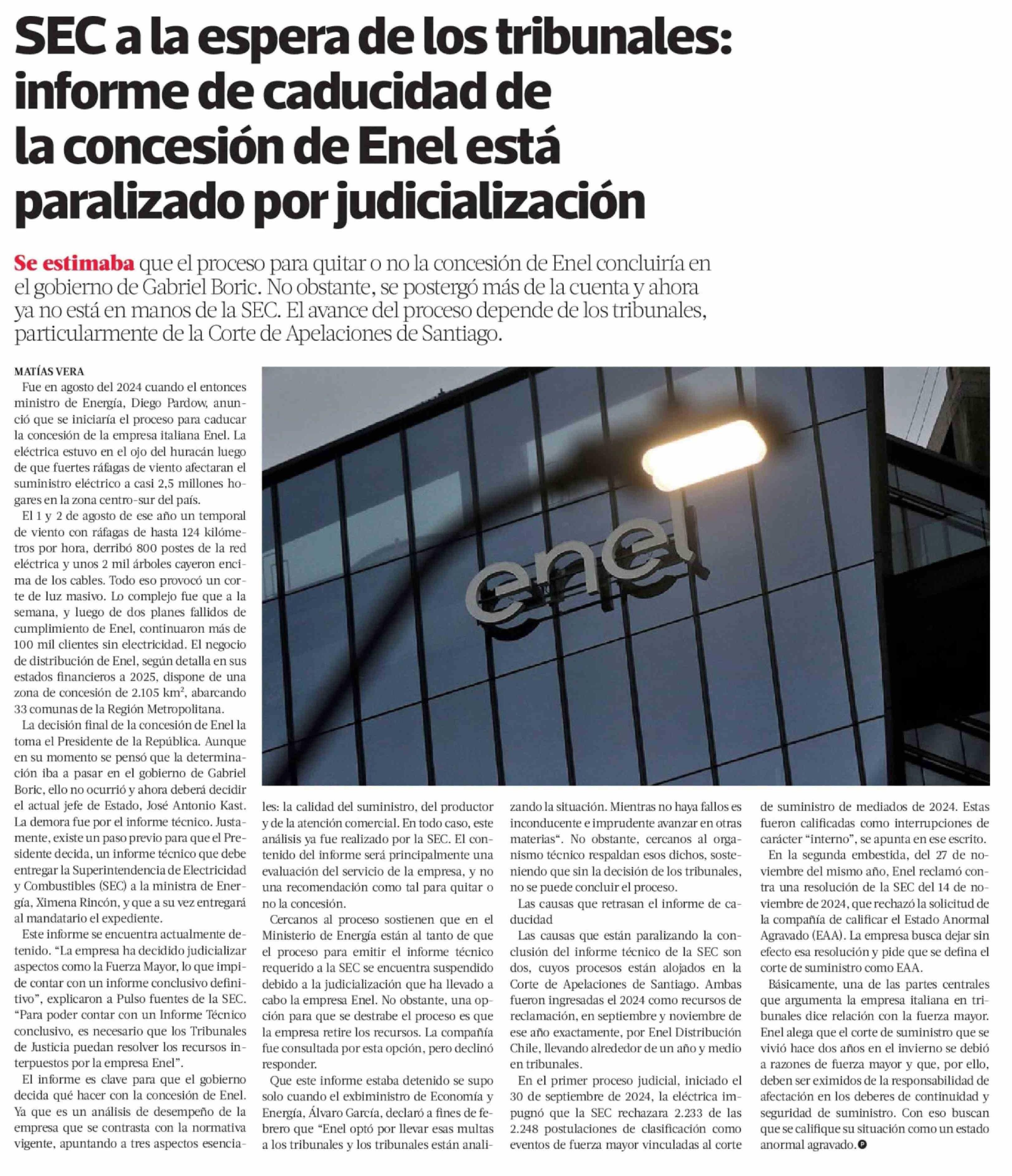 Título: SEC a la espera de los tribunales: informe de caducidad de la concesión de Enel está paralizado por judicialización