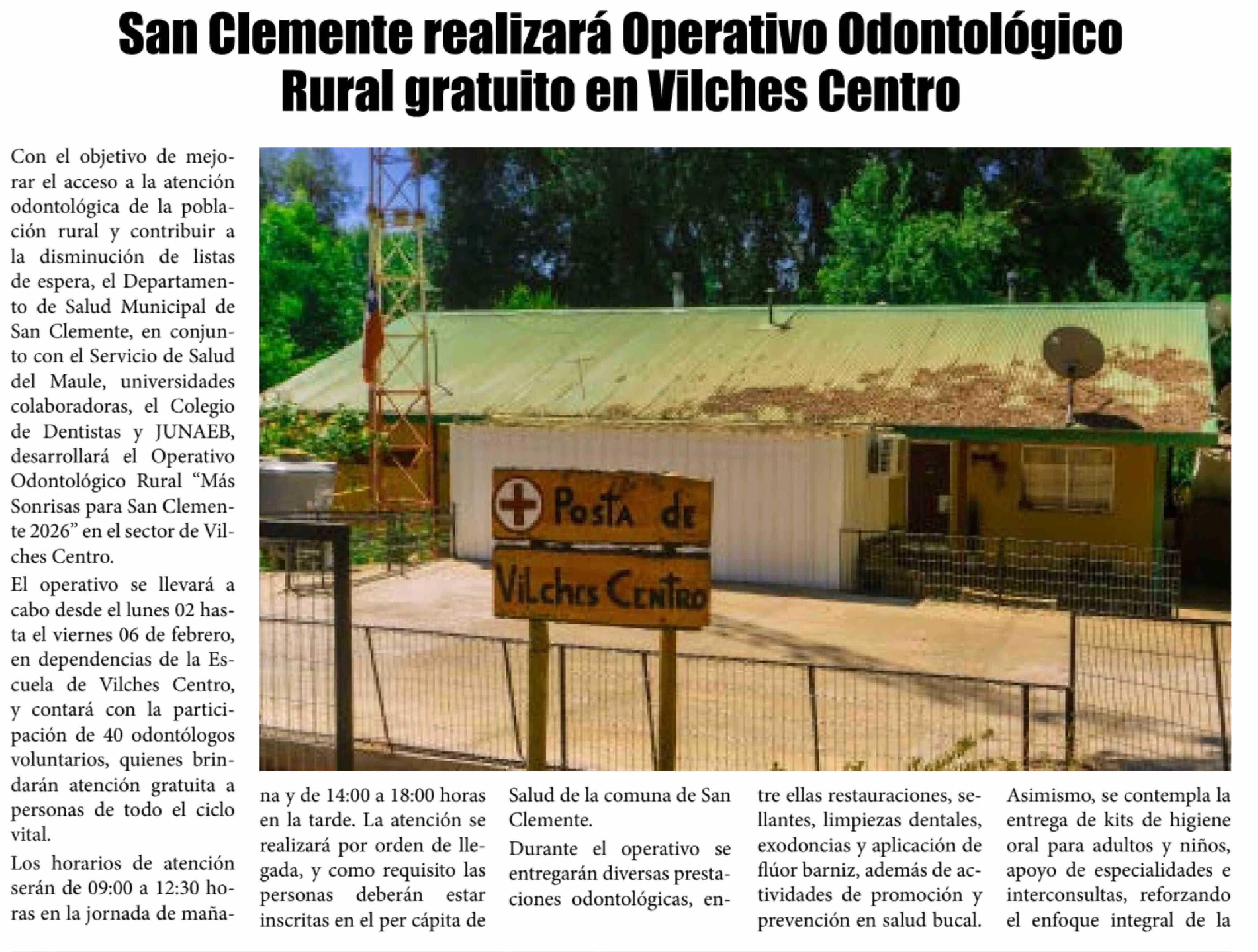 Título: San Clemente realizará Operativo Odontológico Rural gratuito en Vilches Centro