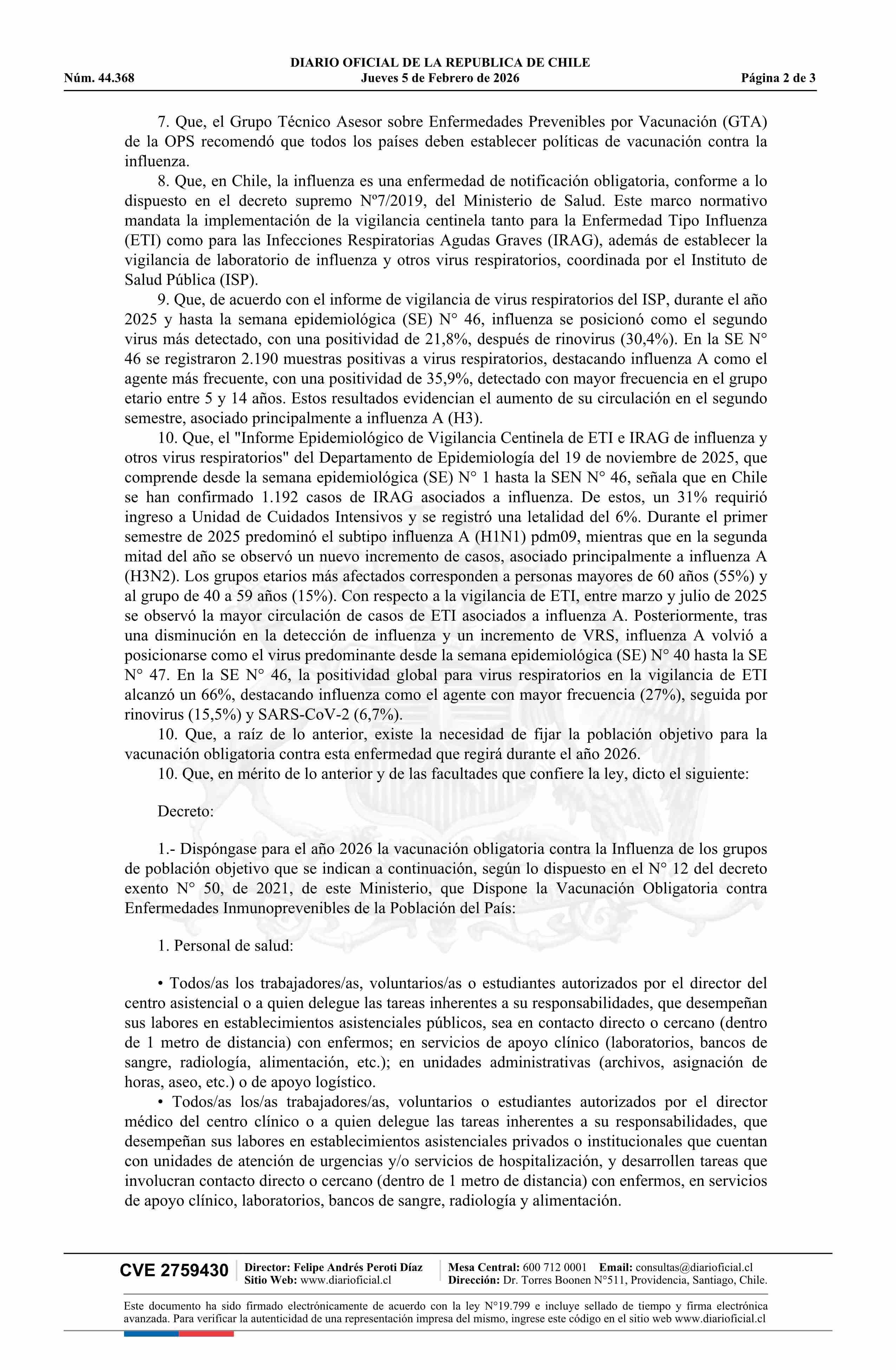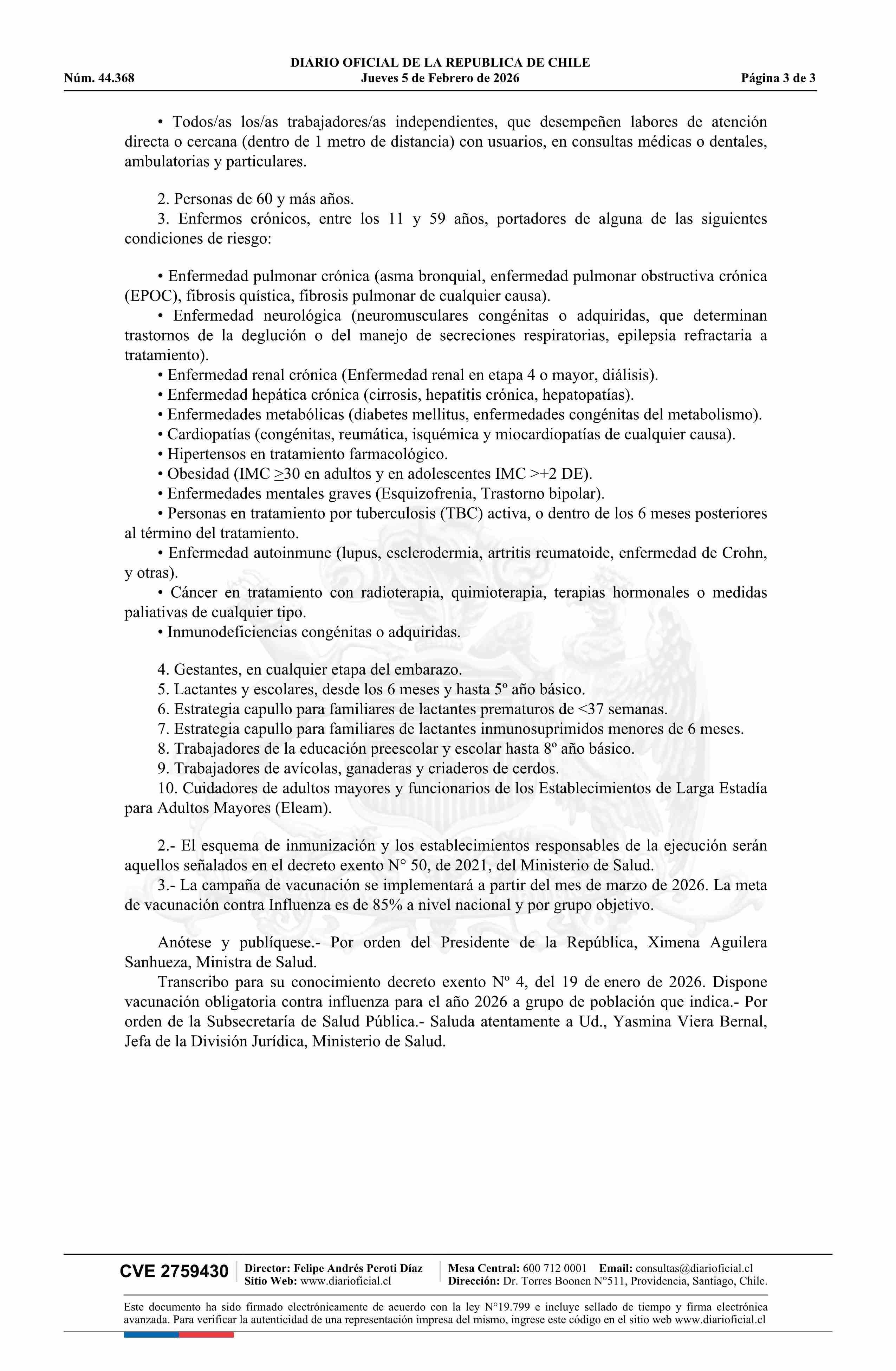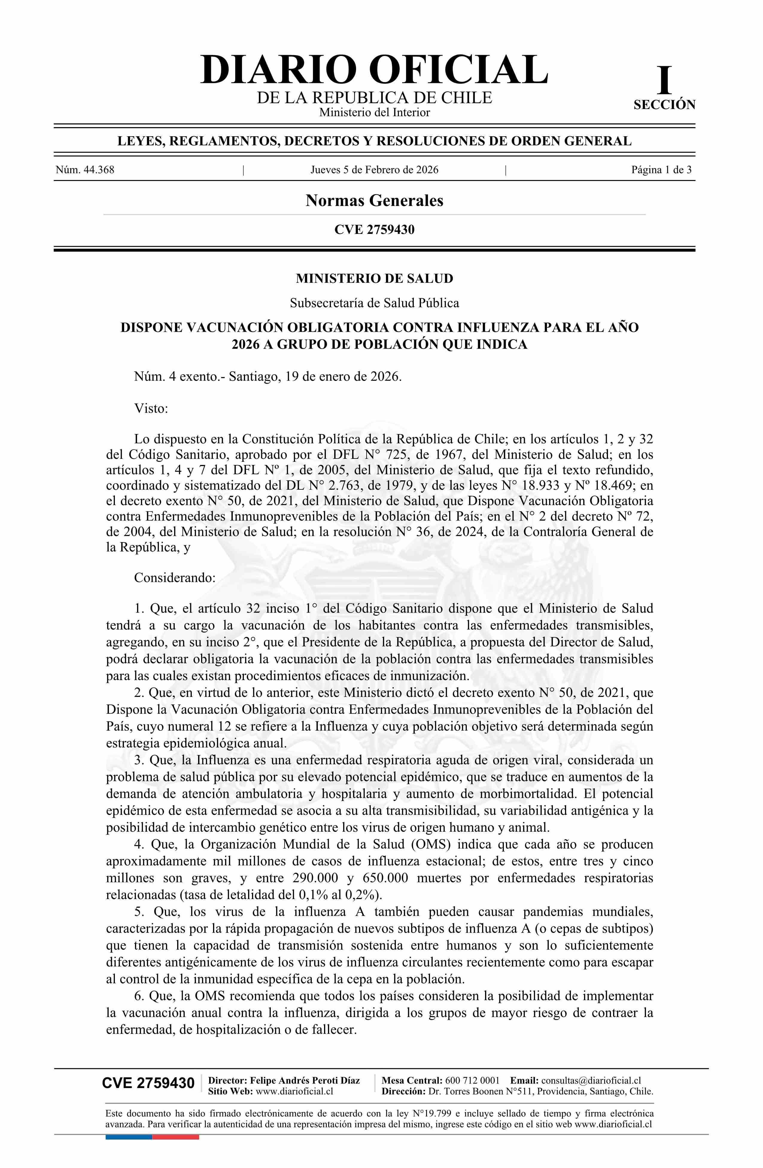 Título: Decreto exento número 4, de 2026.- Dispone vacunación obligatoria contra influenza para el año 2026 a grupo de población que indica