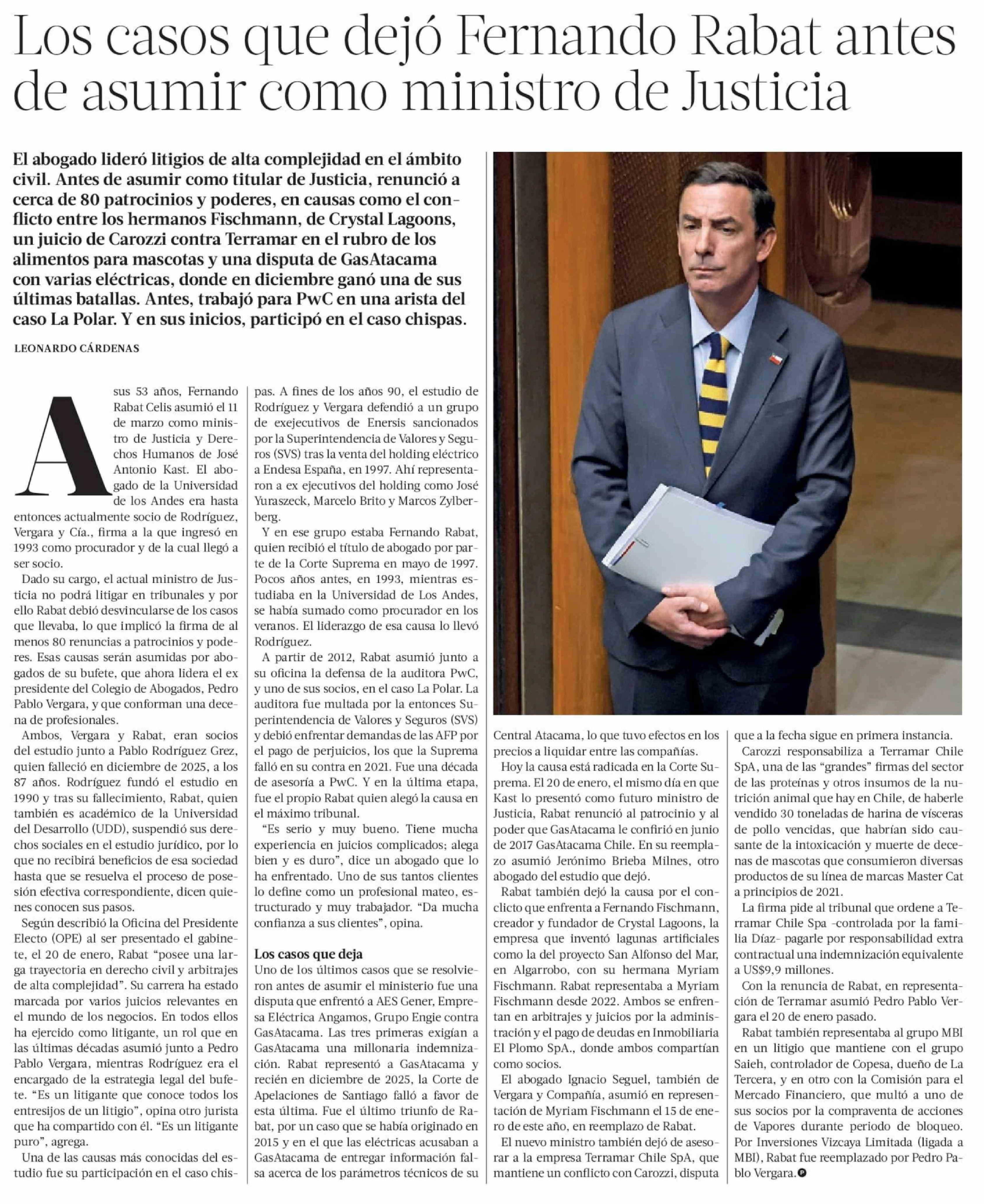 Los casos que dejó Fernando Rabat antes de asumir como ministro de Justicia 28-03-2026 La Tercera |