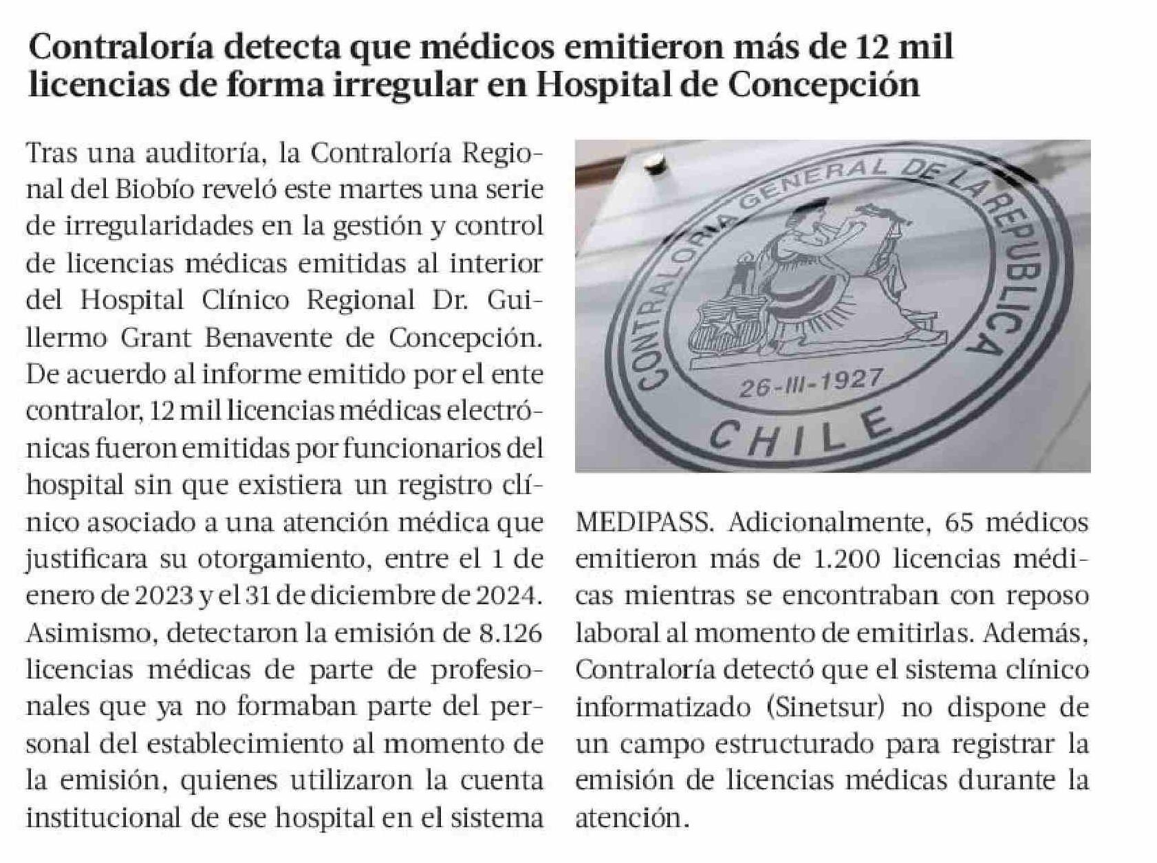 Título: Contraloría detecta que médicos emitieron más de 12 mil licencias de forma irregular en Hospital de Concepción