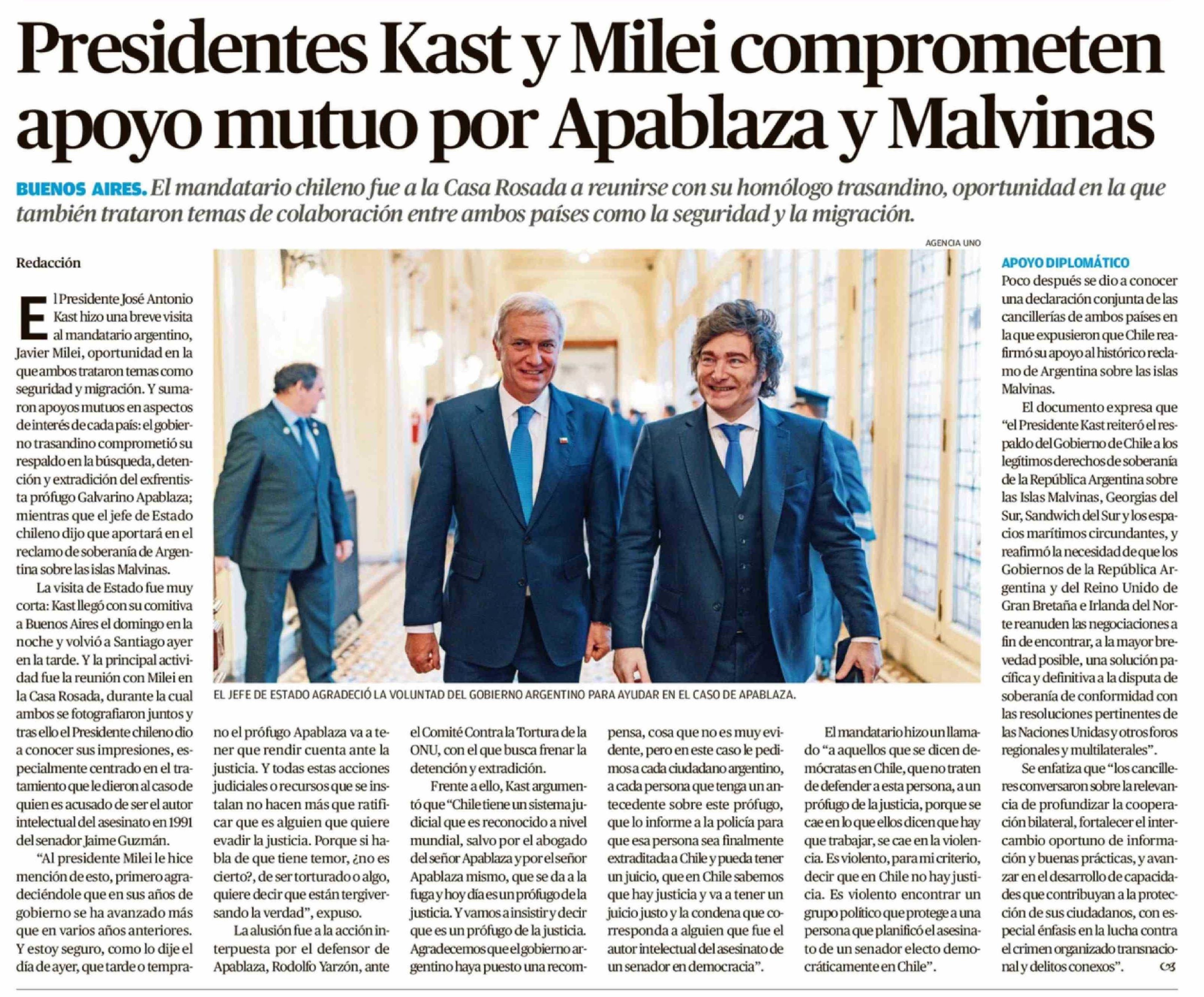 | Título: | Presidentes Kast y Milei comprometen apoyo mutuo por Apablaza y Malvinas |
