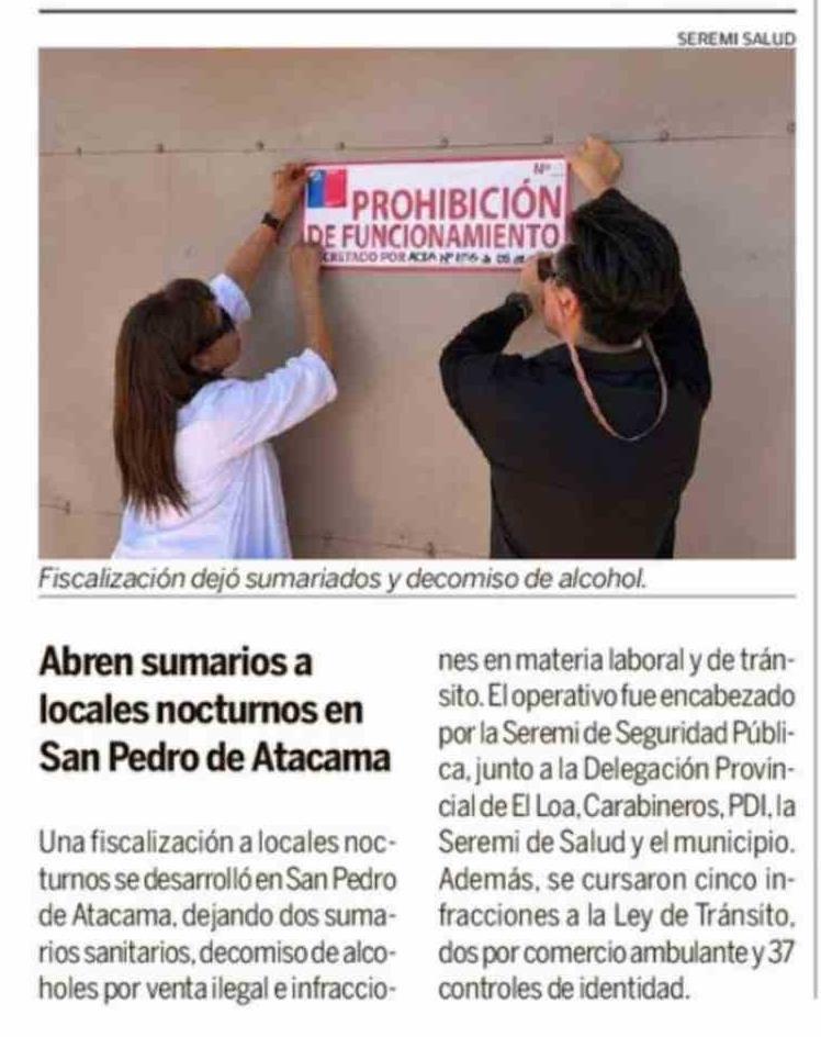 | Título: | Abren sumarios a locales nocturnos en San Pedro de Atacama |