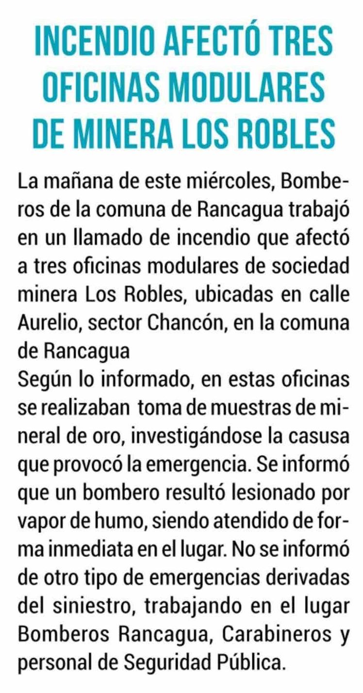 INCENDIO AFECTÓ TRES OFICINAS MODULARES DE MINERA LOS ROBLES La mañana de este miércoles, Bomberos de la comuna de Rancagua trabajó en un llamado de incendio que afectó a tres oficinas modulares de sociedad minera Los Robles, ubicadas en calle Aurelio, sector Chancon, en la comuna de Rancagua Según
