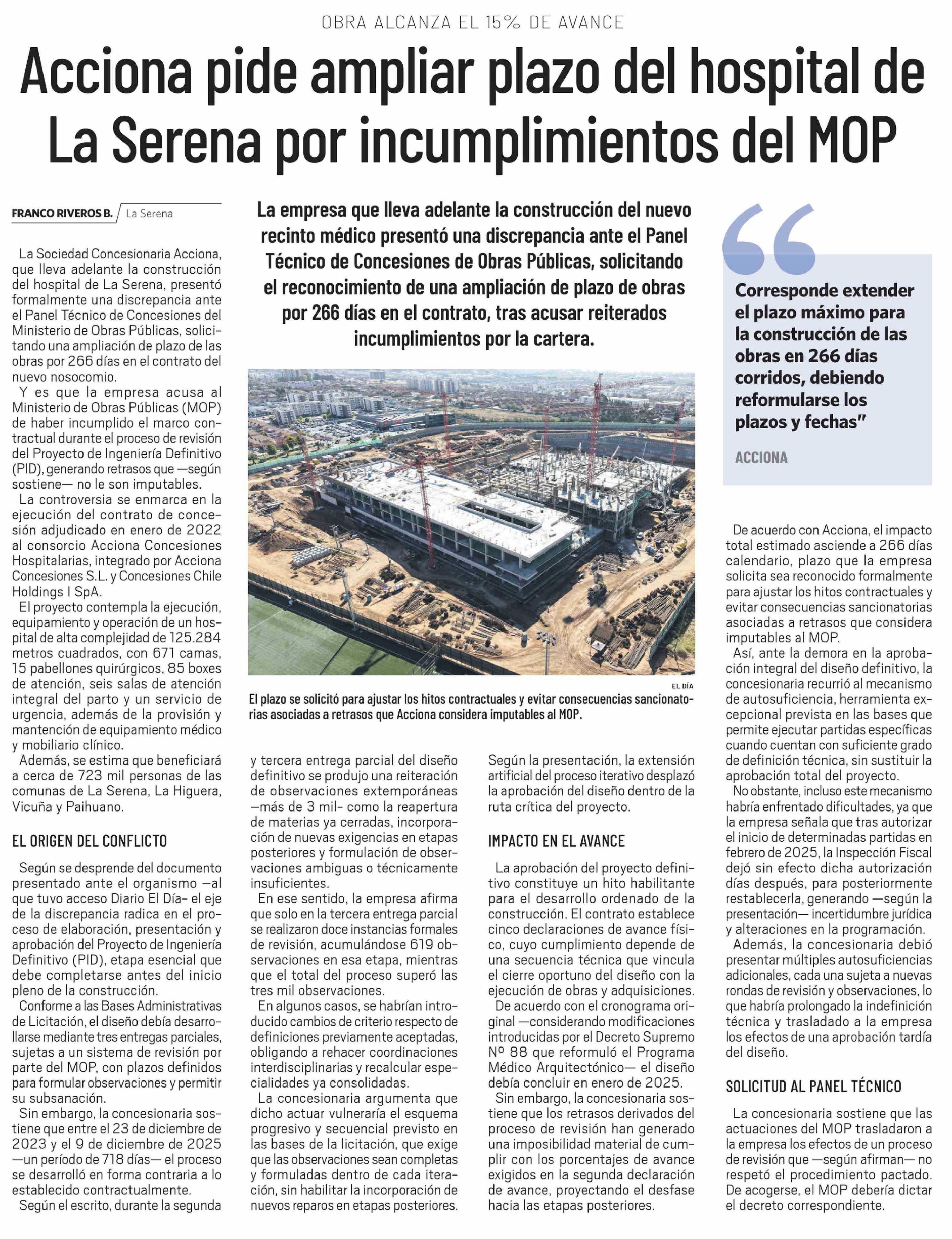 Título: Acciona pide ampliar plazo del hospital de La Serena por incumplimientos del MOP