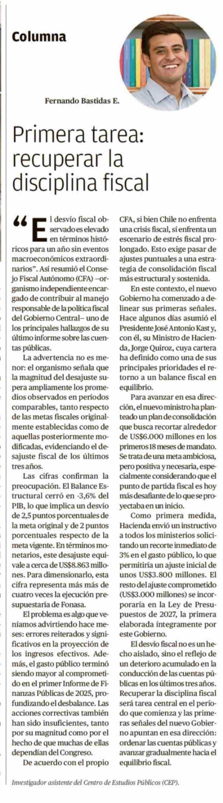 Columnas de Opinión: Primera tarea: recuperar la disciplina fiscal 15-03-2026 El Llanquihue |
