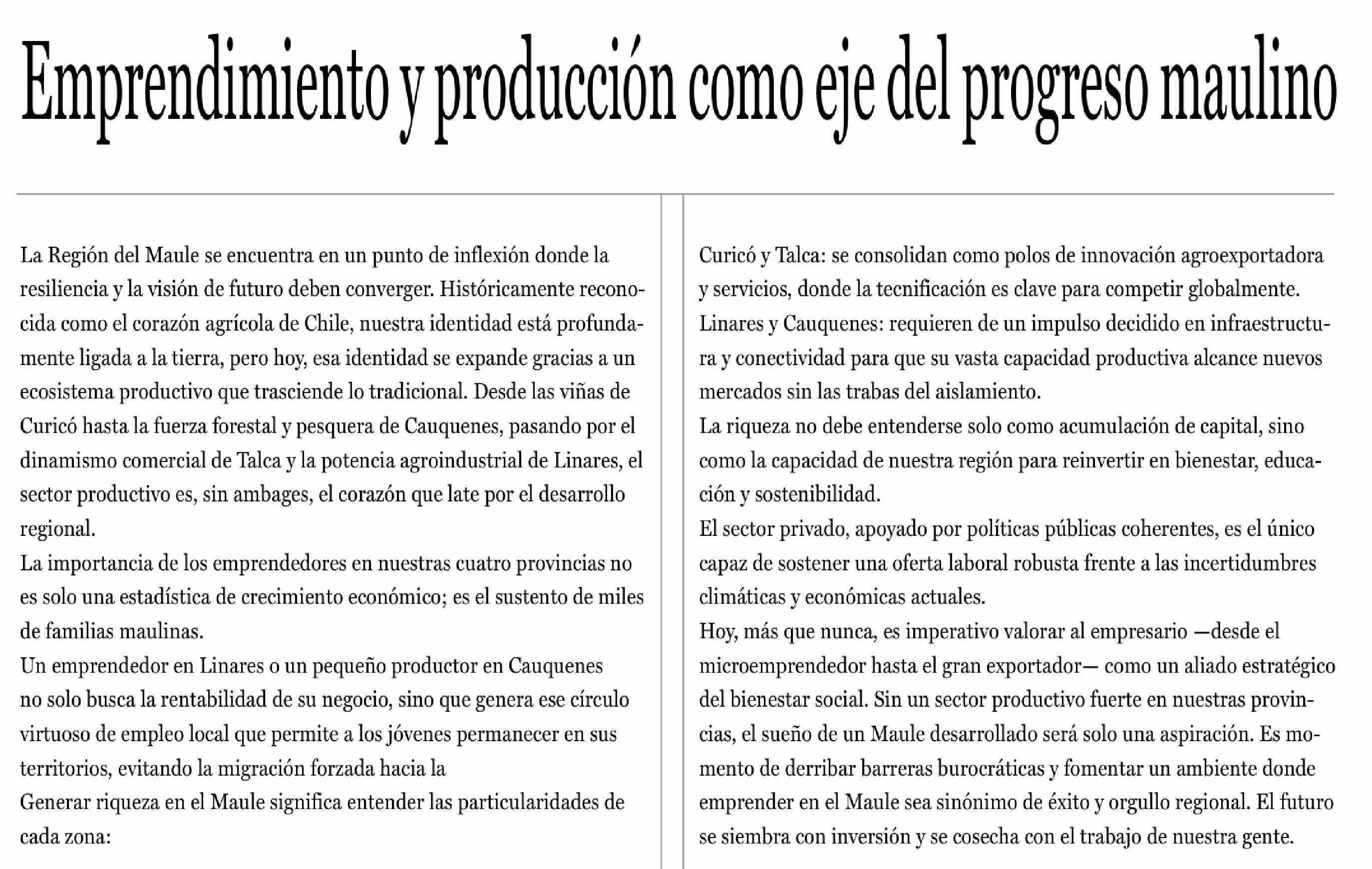 Editorial: Emprendimiento y producción como eje del progreso maulino 09-02-2026 La Prensa de Curicó |
