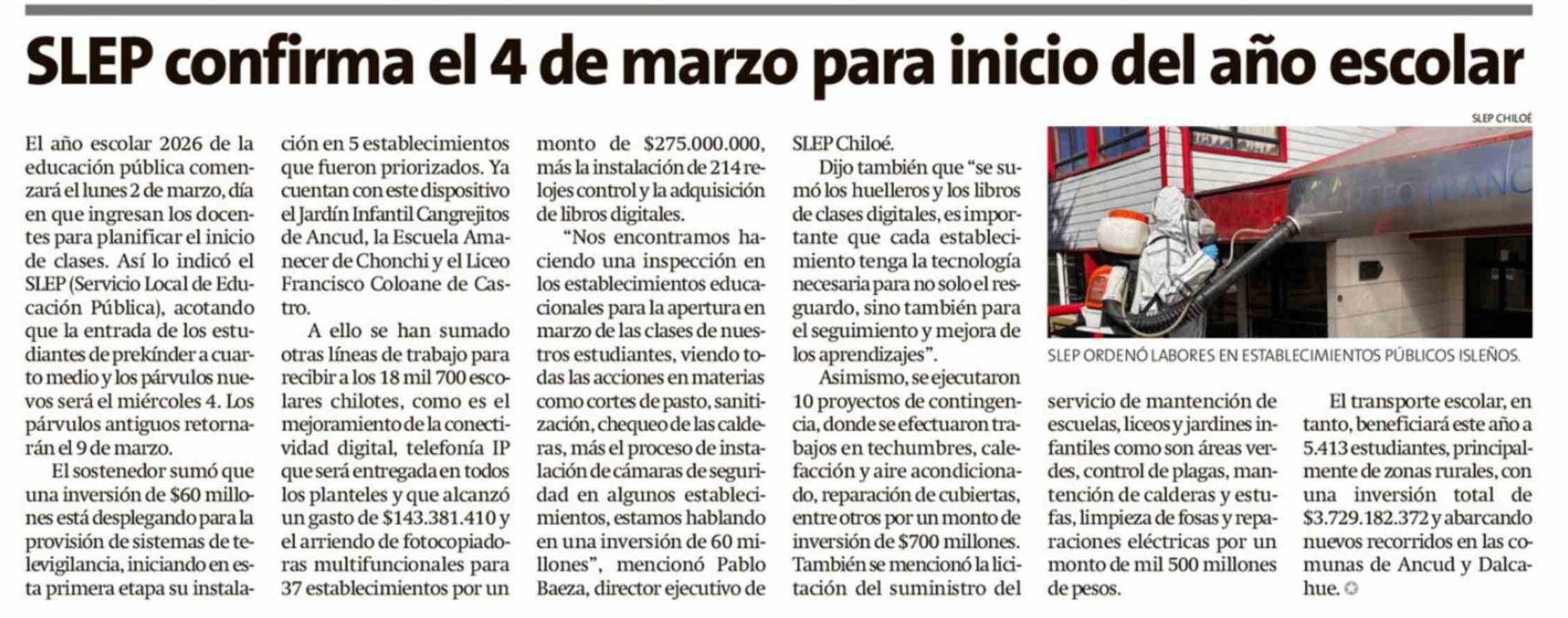 SLEP confirma el 4 de marzo para inicio del año escolar 26-02-2026 La Estrella de Chiloé |