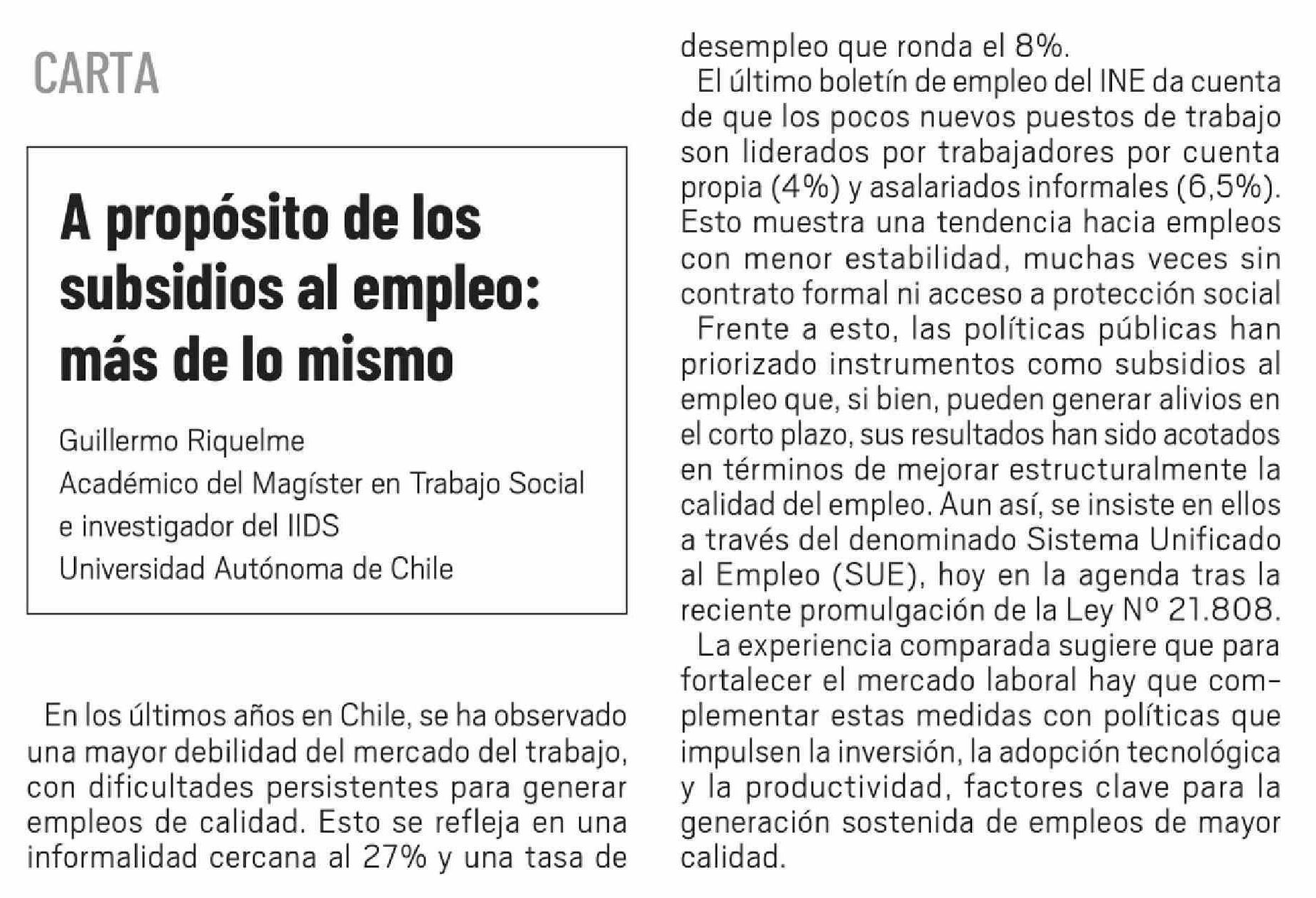 Título: Cartas: A propósito de los subsidios al empleo: más de lo mismo