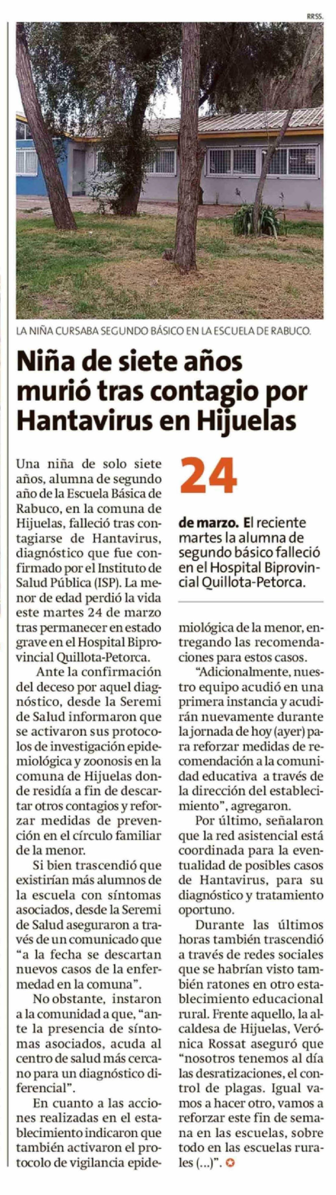 Título: Niña de siete años murió tras contagio por Hantavirus en Hijuelas