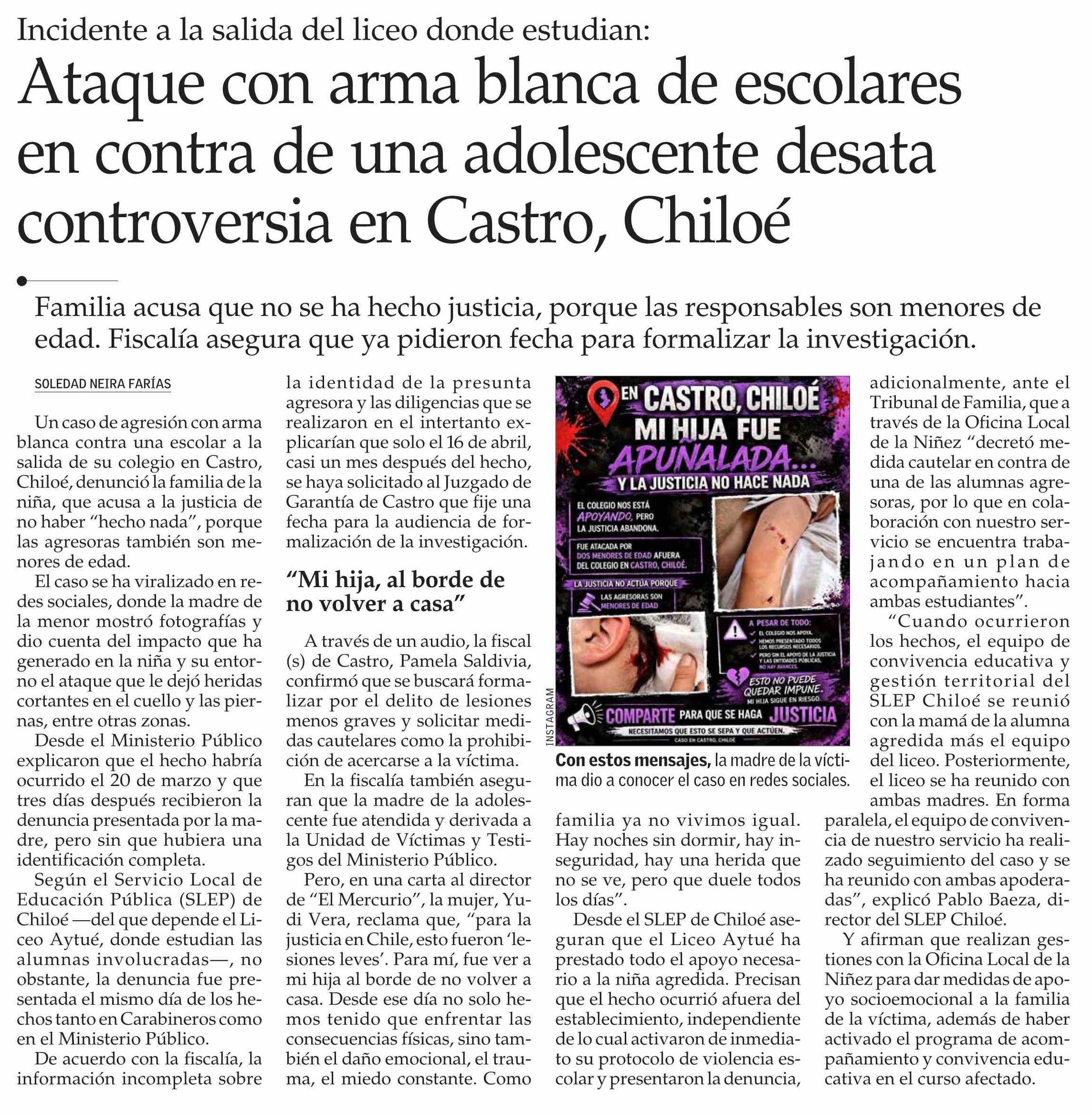 Ataque con arma blanca de escolares en contra de una adolescente desata controversia en Castro, Chiloé 18-04-2026 El Mercurio |
