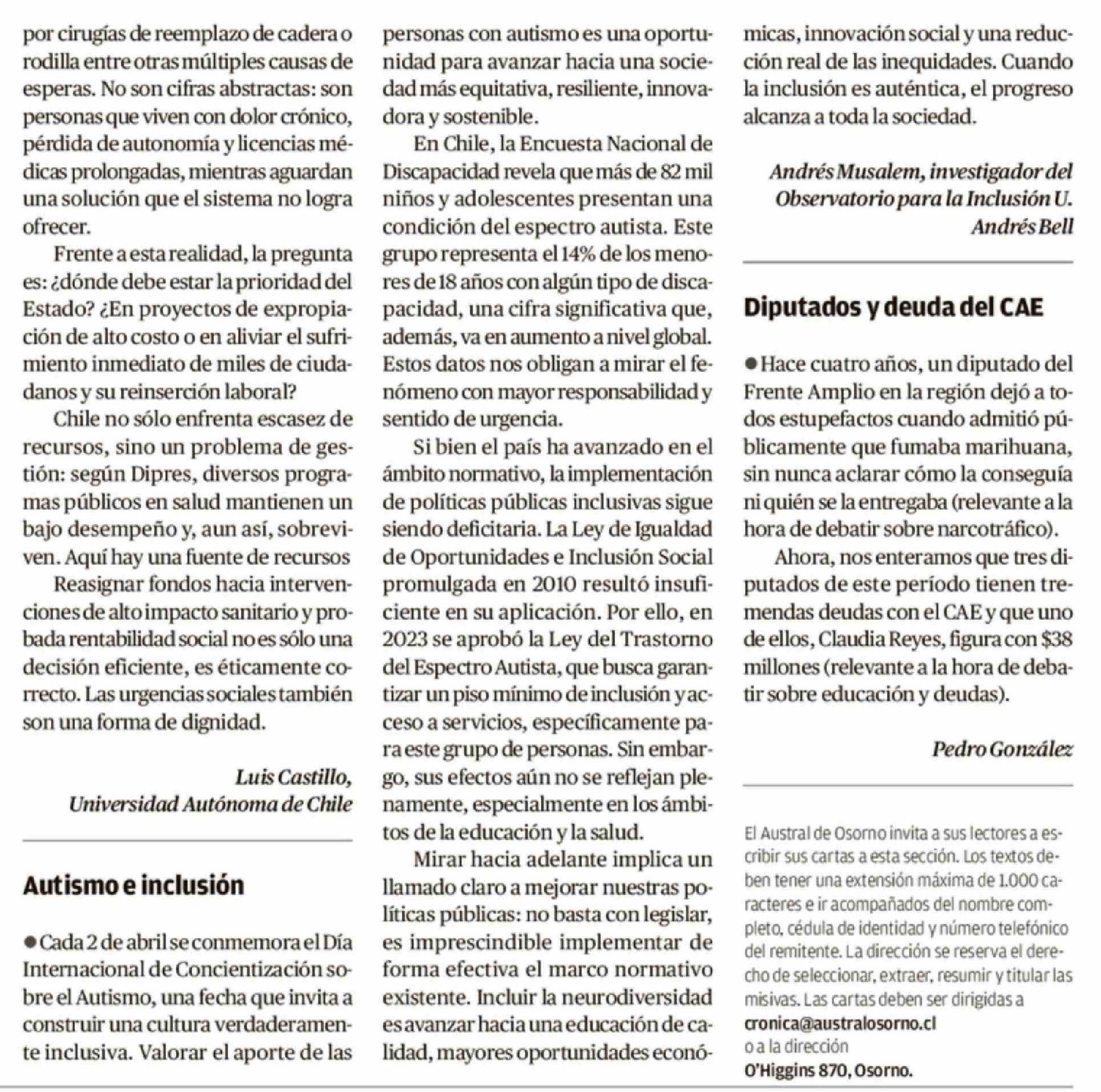 Cartas: Autismo e inclusión 02-04-2026 El Austral de Osorno |