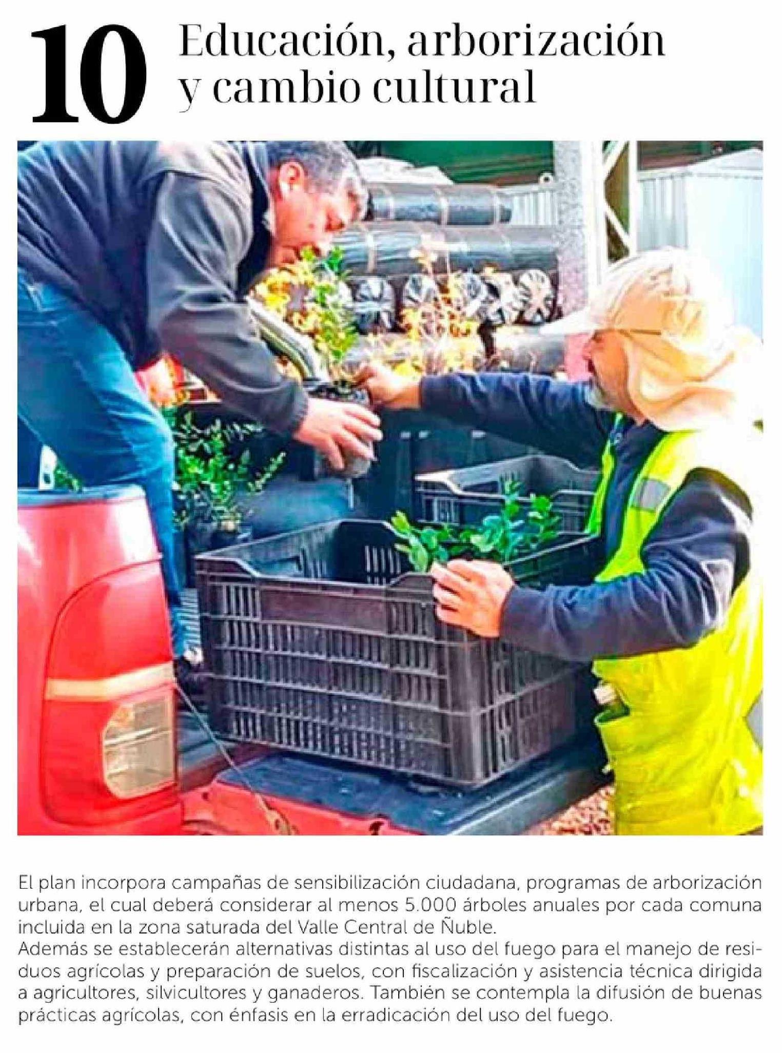 | Título: | El plan incorpora campañas de sensibilización ciudadana, programas de arborización urbana, el cual deberá considerar al menos 5.000 árboles anuales por cada comuna incluida en la zona saturada del Valle Central de Ñuble. Además se establecerán alternativas distintas al uso del fuego para el manejo d |