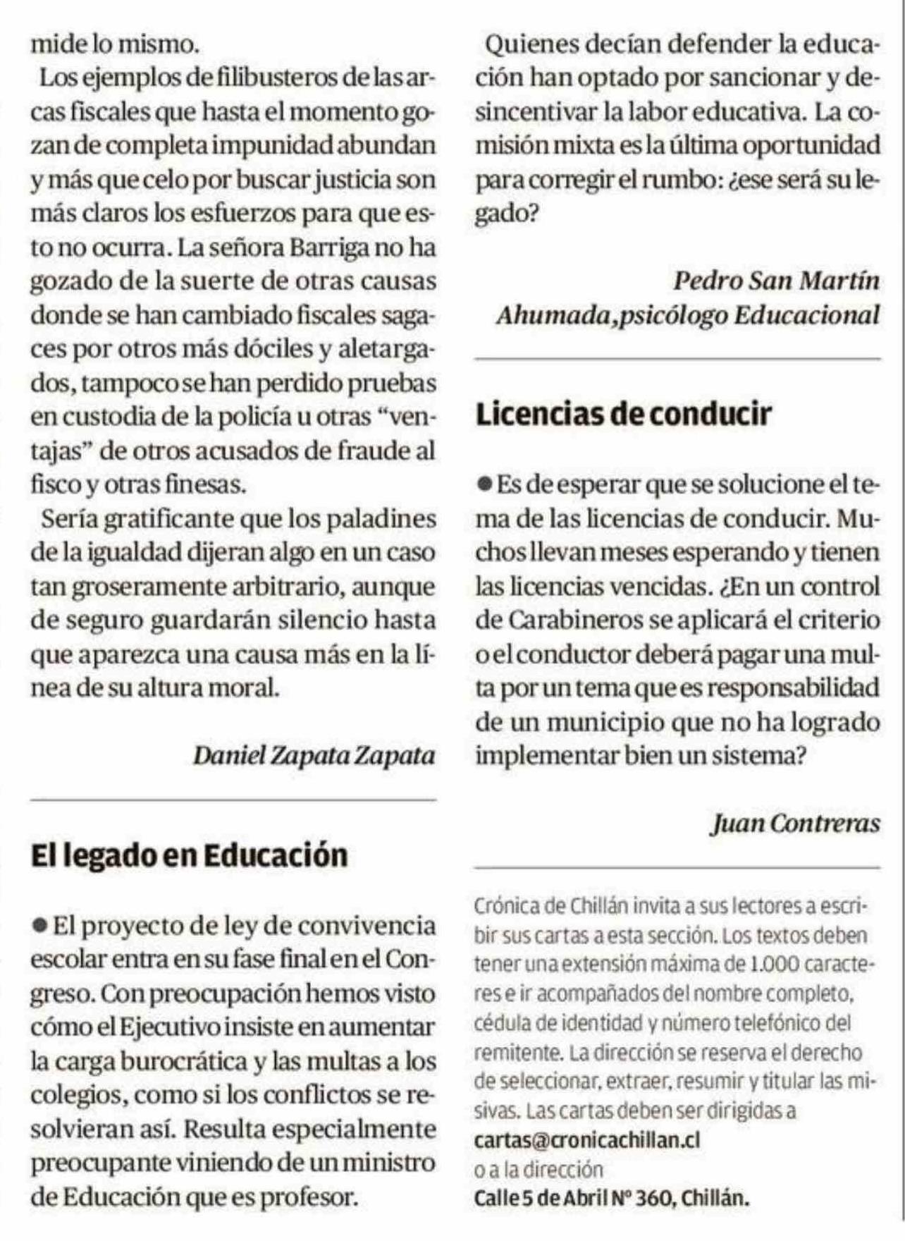 Cartas: El legado en Educación 23-01-2026 Crónica de Chillán |