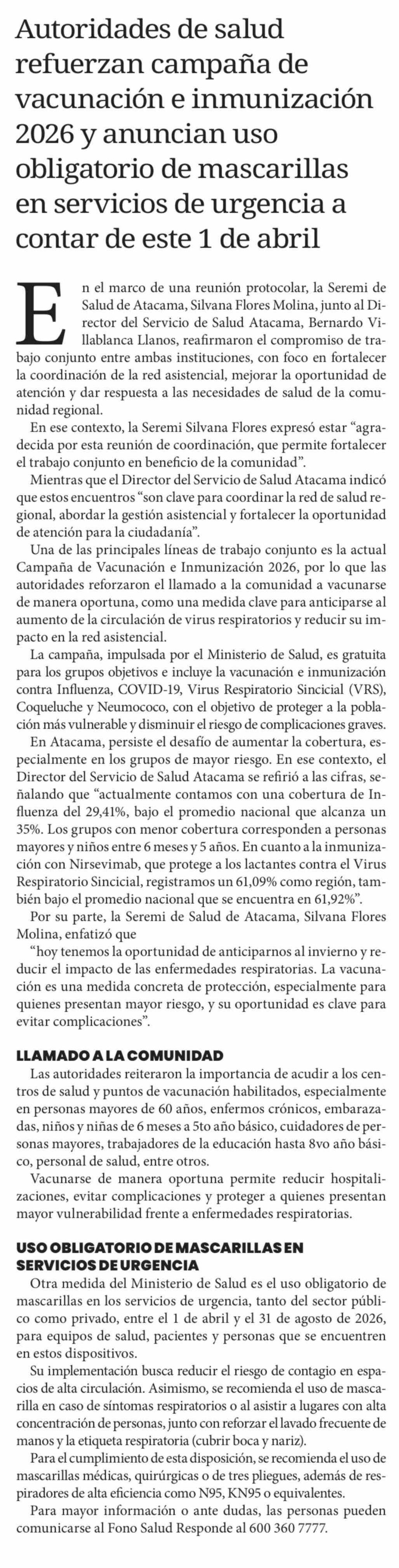 Título: Autoridades de salud refuerzan campaña de vacunación e inmunización 2026 y anuncian uso obligatorio de mascarillas en servicios de urgencia a contar de este 1 de abril