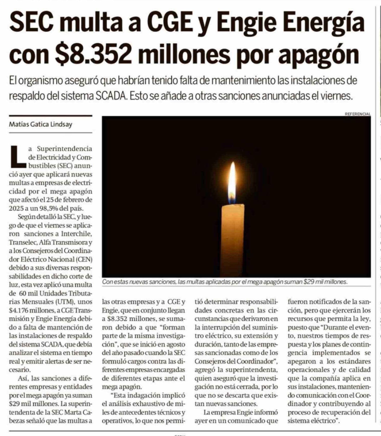 | Título: | SEC multa a CGE y Engie Energía con $8.352 millones por apagón |