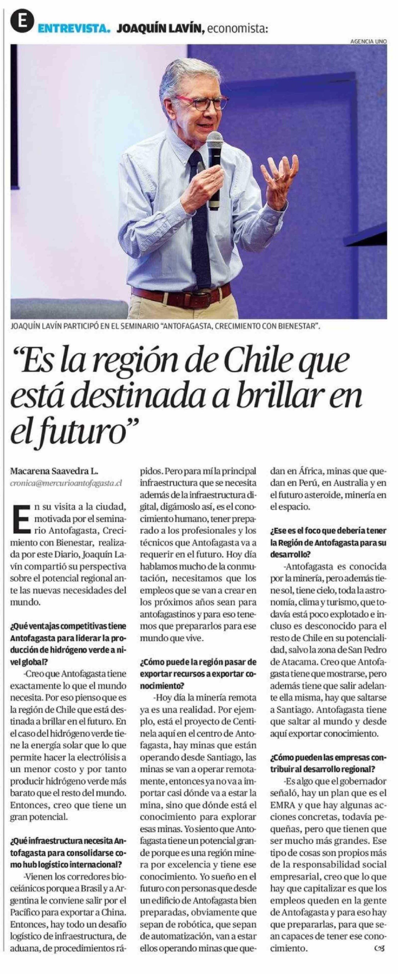 "Es la región de Chile que está destinada a brillar en el futuro" 19-04-2026 El Mercurio de Calama |