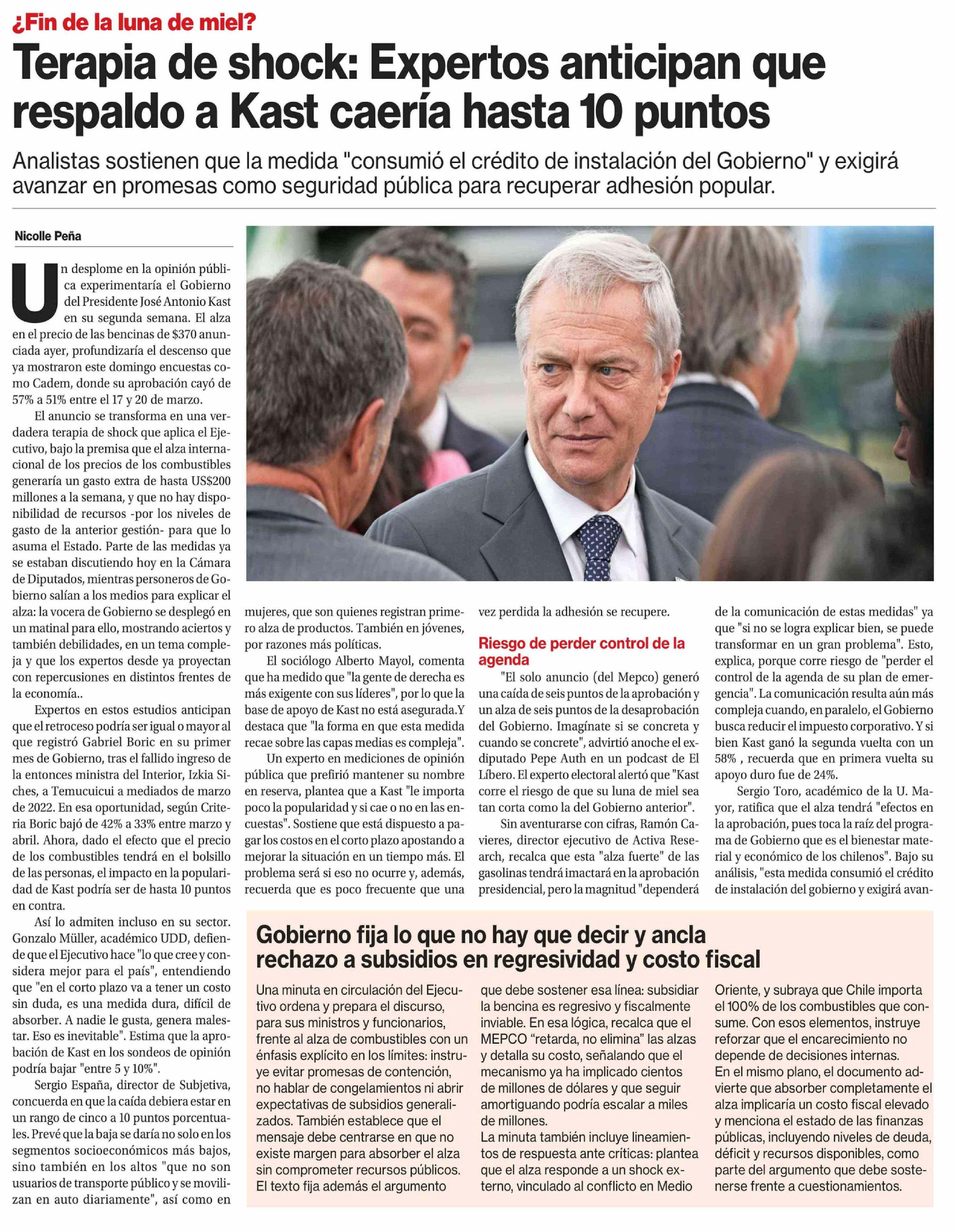 Terapia de shock: Expertos anticipan que respaldo a Kast caería hasta 10 puntos 24-03-2026 La Segunda |
