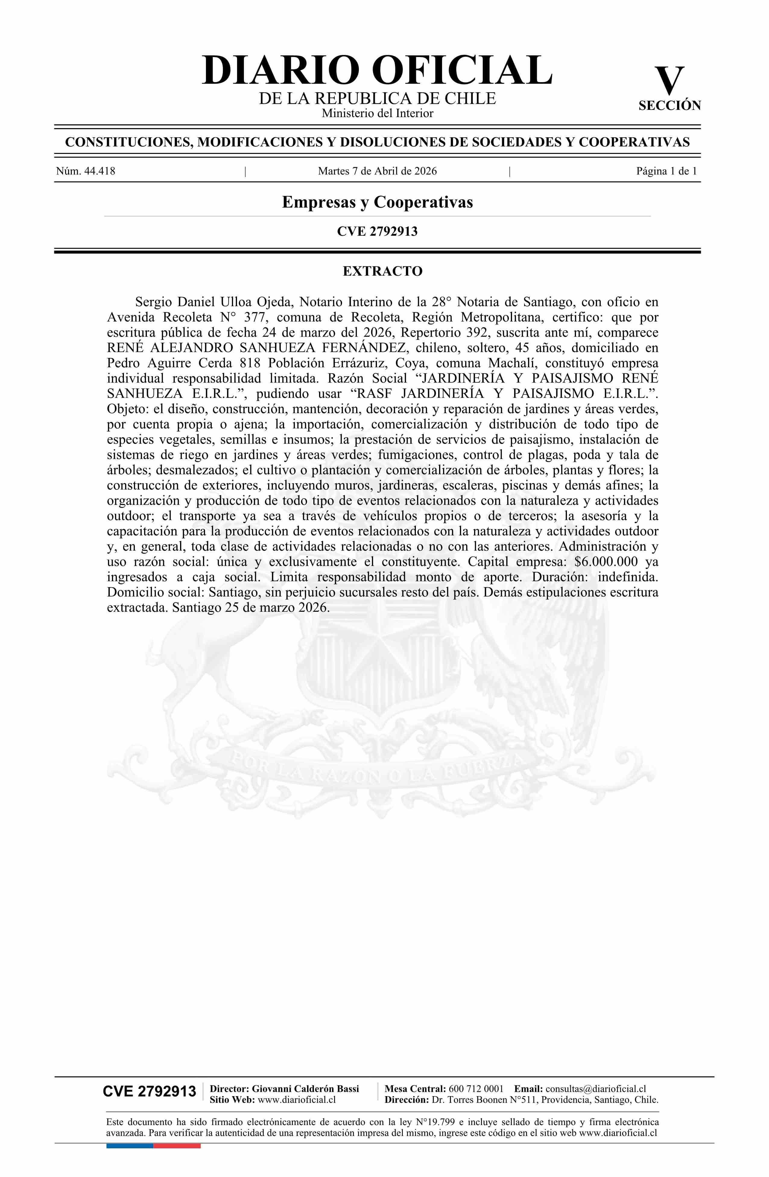 Título: JARDINERÍA Y PAISAJISMO RENÉ SANHUEZA E.I.R.L.