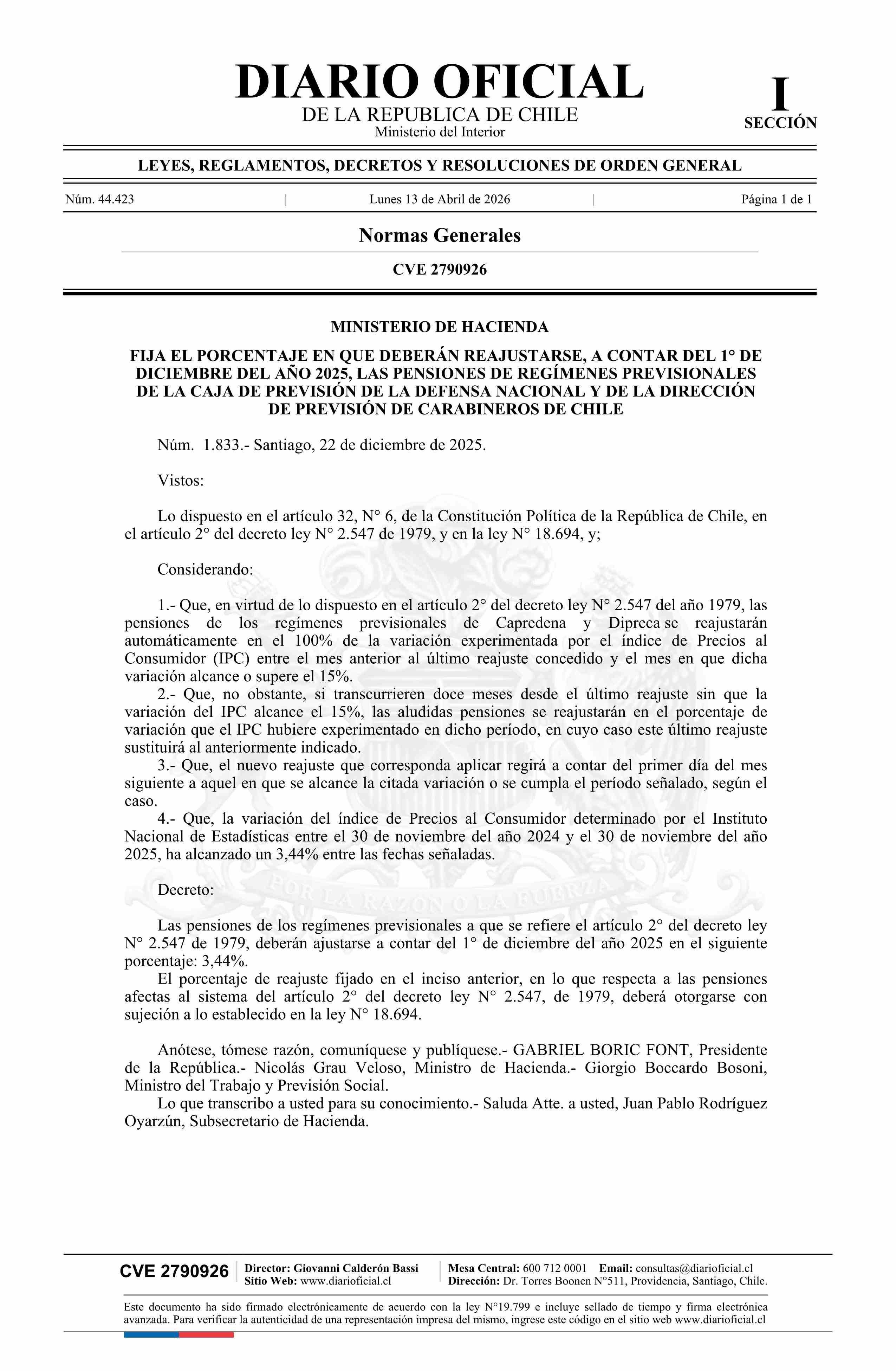Título: Decreto número 1.833, de 2025.- Fija el porcentaje en que deberán reajustarse, a contar del 1° de diciembre del año 2025, las pensiones de regímenes previsionales de la Caja de Previsión de la Defensa Nacional y de la Dirección de Previsión de Carabineros de Chile